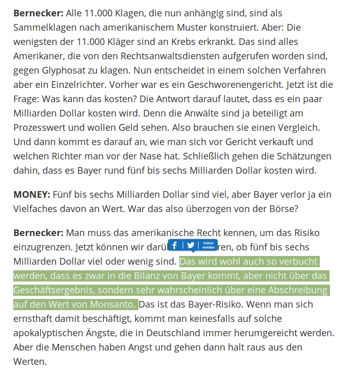John Silver Mai 5, 2019 · bearbeitet Mai 5, 2019 von John Silver Zitat ... Das maximale Risiko aus den US-Gerichtsverfahren Damit bestätigt sich letztlich nur, was ich zuletzt schon in mehreren Artikeln hier bei sharedeals.de geschrieben habe. Doch lassen Sie, liebe Leserinnen und Leser, uns mal zusammen rechnen wie hoch die maximalen finanziellen Risiken aus den US-Gerichtsverfahren wohl sind. Dazu muss man wissen, dass US-Gerichte in den letzten Jahren für Menschenleben einen Schadenersatz zwischen 400.000 und 500.000 US-Dollar angesetzt haben. Generell sollte man aktuell wohl eher das obere Ende anvisieren. Denn da Geld sich im Laufe der Zeit durch Inflation entwertet, steigen solche Summen tendenziell an. Allerdings muss man eben auch berücksichtigen, dass es – auf Basis der Einschätzung der EPA – nicht mehr um Menschenleben geht. Denn wenn Glyphosat und damit „Roundup“ nicht krebserregend sind, müsste der Schadenersatz tendenziell niedriger ausfallen. Insofern ist eine Rechnung mit 500.000 US-Dollar schon eher ein Worst Case. Dennoch sind 500.000 US-Dollar weit weniger als die zuletzt ausgeurteilten rund 80 Mio. US-Dollar. Ferner muss man noch wissen, dass aktuell 13.400 Klagen gegen Monsanto/Bayer anhängig sind. Kalkulieren wir hier mal mit 10.000 erfolgreichen Klagen. Dann kämen auf Bayer im „Worst Case“ Schadenersatzzahlungen von 10.000x 500.000 US-Dollar und somit fünf Milliarden US-Dollar zu. Fazit: Unschön, aber keinerlei Grund zur Panik! Dazu kommen dann noch Anwalts- und Gerichtskosten, die sich sicherlich nochmals auf zwei bis drei Milliarden US-Dollar belaufen könnten. Insgesamt dürfte Bayer am Ende also mit einem Schaden in Höhe von weniger als 10 Mrd. US-Dollar davon kommen. Das wäre ein ähnliches Volumen wie seinerzeit bei Lipobay. Wobei sich diese Kosten – ebenfalls wie bei Lipobay – auf mehrere Jahre verteilen, so dass sie ganz sicher nicht bestandsgefährdend für den Konzern sind. Ferner muss noch berücksichtigt werden, dass Bayer durch diese Zahlungen niedrigere Gewinne ausweisen und somit auch Steuern einsparen wird. Daher halte ich, wie schon zuletzt geschrieben, die Halbierung des Börsenwerts im Zuge dieser „Monsanto Krise“ für völlig überzogen. Zwar kann auch die Bayer Aktie, je nach Entwicklung des Gesamtmarktes, nochmal unter Abgabedruck geraten und vielleicht die bisherigen Tiefstkurse ansteuern. Das sollte es dann aber gewesen sein. ... https://www.sharedeals.de/bayer-endlich-ein-erster-etappensieg-in-den-usa/ Der o.g. Artikel geht von einer max. Schadenssumme von $5- $10 Mrd. aus. Zitat 29.04.2019 10:32:40 MÜNCHEN (dpa-AFX) - Die Baader Bank hat die Einstufung für Bayer nach der Nicht-Entlastung des Vorstanden durch die Hauptversammlung auf "Buy" mit einem Kursziel von 123 Euro belassen. ... https://www.boerse-online.de/nachrichten/aktien/analyse-flash-baader-bank-belaesst-bayer-auf-buy-ziel-123-euro-1028147395 Die Baader Bank hat ihr Kursziel von € 123 bestätigt. Zitat ... MONEY: Nun finden die entscheidenden Prozesse jedoch in den USA statt. Und die Richter geben bislang den Klägern Recht. Was kann da noch auf Bayer zukommen? Bernecker: Alle 11.000 Klagen, die nun anhängig sind, sind als Sammelklagen nach amerikanischem Muster konstruiert. Aber: Die wenigsten der 11.000 Kläger sind an Krebs erkrankt. Das sind alles Amerikaner, die von den Rechtsanwaltsdiensten aufgerufen worden sind, gegen Glyphosat zu klagen. Nun entscheidet in einem solchen Verfahren aber ein Einzelrichter. Vorher war es ein Geschworenengericht. Jetzt ist die Frage: Was kann das kosten? Die Antwort darauf lautet, dass es ein paar Milliarden Dollar kosten wird. Denn die Anwälte sind ja beteiligt am Prozesswert und wollen Geld sehen. Also brauchen sie einen Vergleich. Und dann kommt es darauf an, wie man sich vor Gericht verkauft und welchen Richter man vor der Nase hat. Schließlich gehen die Schätzungen dahin, dass es Bayer rund fünf bis sechs Milliarden Dollar kosten wird. MONEY: Fünf bis sechs Milliarden Dollar sind viel, aber Bayer verlor ja ein Vielfaches davon an Wert. War das also überzogen von der Börse? Bernecker: Man muss das amerikanische Recht kennen, um das Risiko einzugrenzen. Jetzt können wir darüber diskutieren, ob fünf bis sechs Milliarden Dollar viel oder wenig sind. Das wird wohl auch so verbucht werden, dass es zwar in die Bilanz von Bayer kommt, aber nicht über das Geschäftsergebnis, sondern sehr wahrscheinlich über eine Abschreibung auf den Wert von Monsanto. Das ist das Bayer-Risiko. Wenn man sich ernsthaft damit beschäftigt, kommt man keinesfalls auf solche apokalyptischen Ängste, die in Deutschland immer herumgereicht werden. Aber die Menschen haben Angst und gehen dann halt raus aus den Werten. ... https://www.finanzen100.de/finanznachrichten/boerse/boom-an-der-boerse-geht-erst-los-sie-koennen-alles-kaufen-den-ganzen-dax_H954390087_10645187/ Und hier noch eine Einschätzung zur Schadenhöhe und zum Kurspotential. Diesen Beitrag teilen Link zum Beitrag