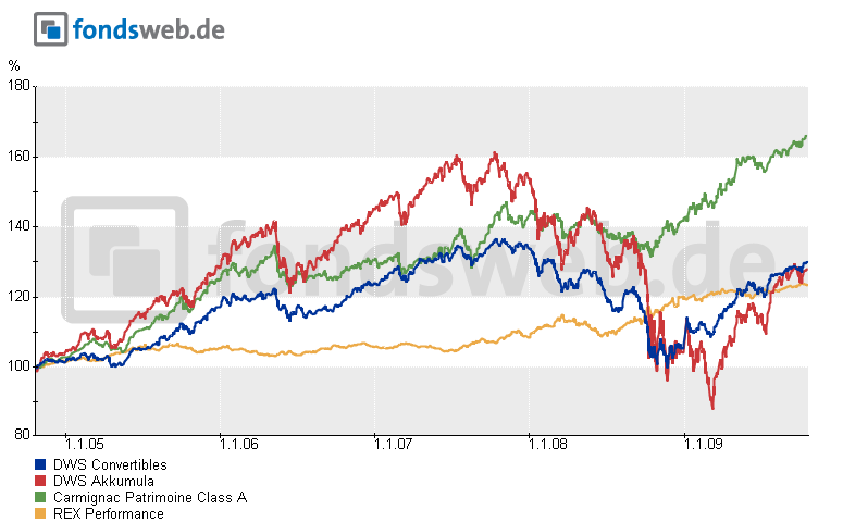 slt63 Oktober 21, 2009 Der 974515 FI Alpha Renten Global ist zwar formal ein Mischfonds, aber die Aktienquote darf maximal 20 % betragen (Kurzprospekt). Dagegen ist eine Anlage in convertibles etwas volatiler und machen die Bewegungen des Aktienmarkts mehr mit. Da in dem betrachteten Zeitraum zwei deutliche Korrekturen der Aktienmärkte enthalten sind (2000-2002 und 2008) verwundert es nicht, dass sich der rentenlastige Mischfonds vergleichsweise gut hält. Ob er tatsächlich von seiner Möglichkeit Gebrauch gemacht hat, die ohnehin schon niedrige Aktienquote in den Krisenzeiten zu reduzieren, habe ich jetzt nicht nachgeprüft. Hier mal der Vergleich beim Zeitraum von gut 5 Jahren und zusätzlich den REX performance Index eingeblendet. Achtung der gewählte Zeitraum ist für den DWS convertibles vorteilhaft. Wer Lust hat, kann mal mit dem Zeitraum spielen und sehen, wie sich die Kurven verschieben. Vergleich DWS Convertibles / FI Alpha Renten Global M.W. kann Erhardt zusätzlich zu den 20% Aktien noch 10% über Derivate abbilden. Erhrhardt macht, wie auch in seinen anderen Fonds, durchaus regen Gebrauch von der Variierung der Aktienquote; hier natürlich nur im vorgegebenen geringeren Rahmen. Ich will aber aus dem srd keinen FI-Alpha Renten Global-srd machen, wir sollten zum Convertibles zurückkehren. Diesen Beitrag teilen Link zum Beitrag