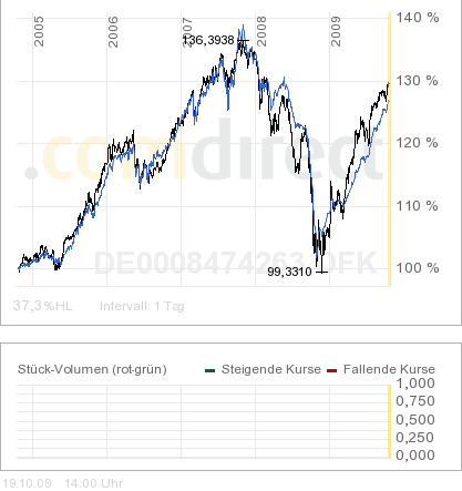 Moneycruncher Oktober 20, 2009 Weiteres kleines Update: +14 % seit 01.01.2009 und damit besser als Aktien, Renten und Immofonds. Wer auf Emerging-Marktet's gesetzt hat, z.b. den Apex50-ETF, das asiatische Stoxx50-Pendant, hat etwa 30% Rendite eingefahren. Das wäre wieder im Einklang mit der Faustregel, dass Wandelanleihen ertragsmäßig etwa in der Mitte zwischen Renten- und Aktienengagements stehen. Interessant ist aus meiner Sicht die Tatsache, dass Wandelanleihen besser performen als der lokale Aktienmarkt. Entweder (europäische) Aktien sind aktuell viel zu billig oder Wandelanleihen sind viel zu teuer. Möglicherweise sind Wandelanleihen aber schlicht und ergreifend die wahren Inflationsgewinner. Das würde nämlich die Performance auch ganz gut erklären. Damit Wandelanleihen kein "Geheimtip" bleiben, hier mal wieder ein kleines Update für den DWS Convertibles: +22% in 2009. Noch beeindruckender finde ich allerdings das Chance-/Risikenverhältnis. Schaut euch mal den 5-Jahres Chart an und vergleicht mit Anleihen oder Aktien...Weiß leider nicht, wie man das einfügt hier.... Diesen Beitrag teilen Link zum Beitrag