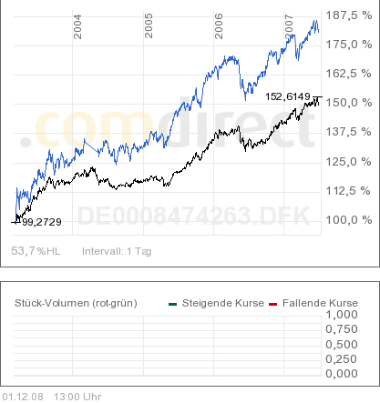 Moneycruncher Januar 29, 2009 Mittlerweile hat sich der Fonds stabilisiert, seit etwa Mitte Oktober läuft der Fonds seitwärts. Im November hat der Fonds sogar zugelegt, während die Aktienmärkte (MSCI World, blau) gut 12 % verloren haben. Im zwischenzeitlichen Abschwung im November hat der DWS Convertibles sogar weniger als 1/3 wie der MSCI World verloren - möglicherweise hat der Fonds das Delta erhöht. Der Grund für die für Wandelanleihen ungewöhnlich hohen Wertverluste im September und Anfang Oktober waren die Zwangsverkäufe von Hedgefonds gewesen, die traditionell stark in Wandelanleihen engagiert sind. Bei Wandelanleihen gibt es im Moment höhere Renditen als bei Unternehmensanleihen und die Wandelrechte gratis dazu. Im Hinblick auf die Abgeltungssteuer könnte ein Kauf bis Jahresende noch interessant sein. Ich bin Anfang Oktober auch aus dem Fonds ausgestiegen und denke derzeit über einen Wiedereinstieg nach. Habt ihr schon gesehen wie prächtig sich der Fonds in den letzten Wochen entwickelt? Seit August hat er nur ca. 5% verloren, des MSCI World dagegen ca. 25%. Für mich ist er jedenfalls ein schönes stabilisierendes Element im Depot. Diesen Beitrag teilen Link zum Beitrag