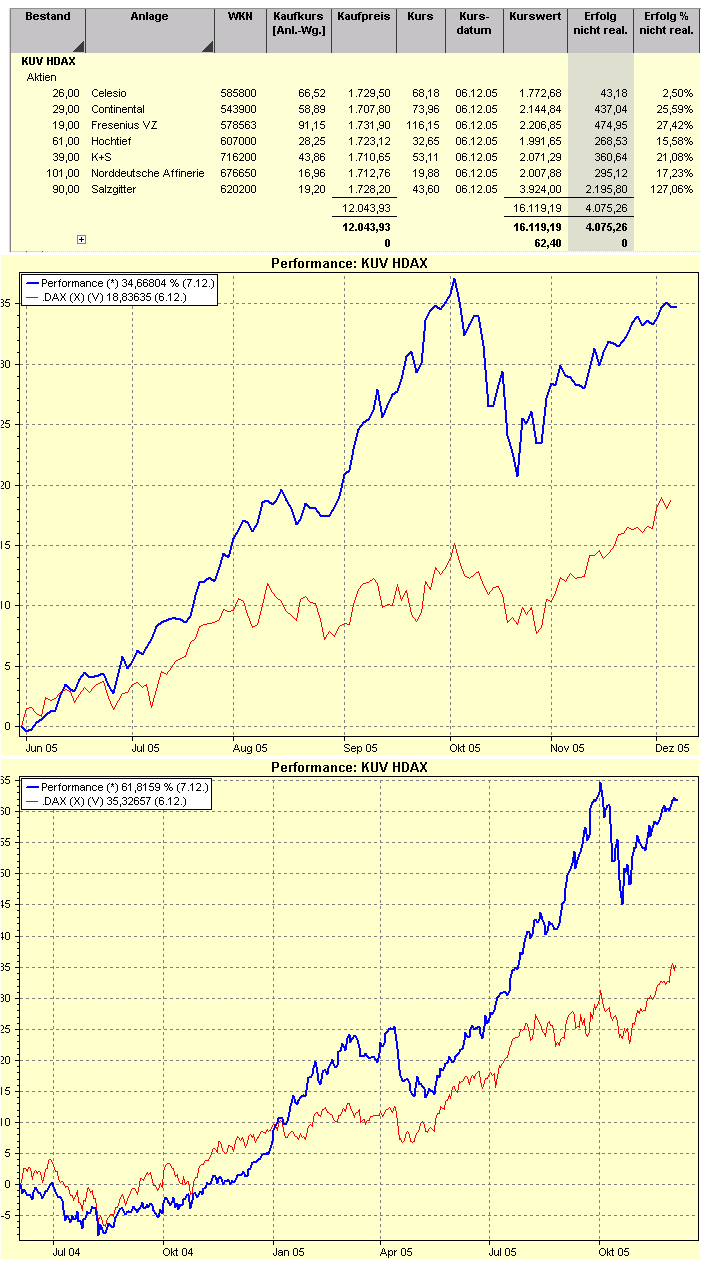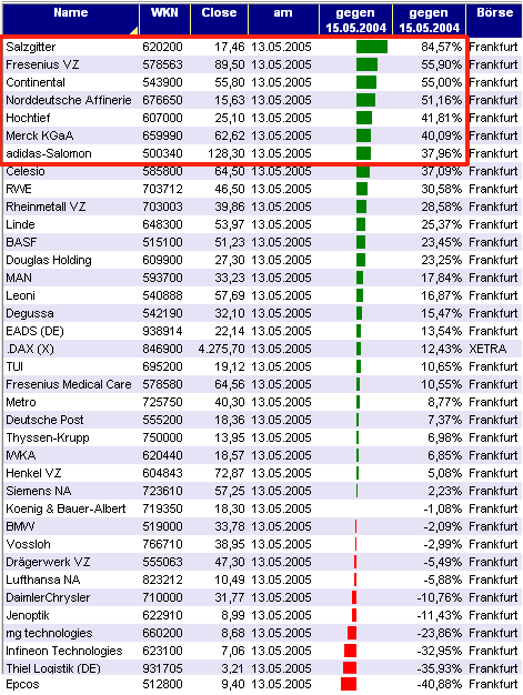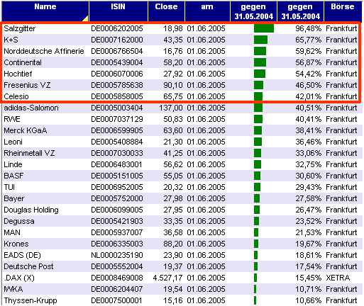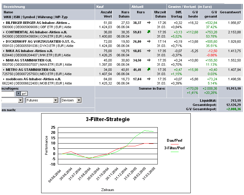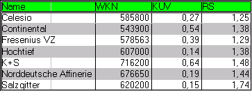 Aktiencrash Mai 16, 2005 Noch einige Tage und das Jahr ist um für das Drei Filter-Strategie Depot. Ich habe mich jetzt schon mal informiert über HDAX Aktien mit einem KUV kleiner 1 und einer Gewinnsteigerung für 2004. Durch den Filter sind bisher die rot markierten Aktien gekommen, die die höchste relative Stärke aufweisen. Die 4 Werte über 50 % dürften mit großer Sicherheit im Depot landen. Die restlichen 3 Aktien könnten noch durch Celesio bzw. RWE ausgestochen werden. Diesen Beitrag teilen Link zum Beitrag