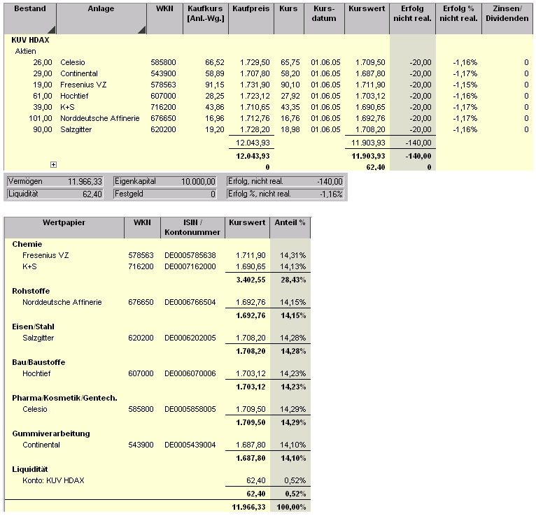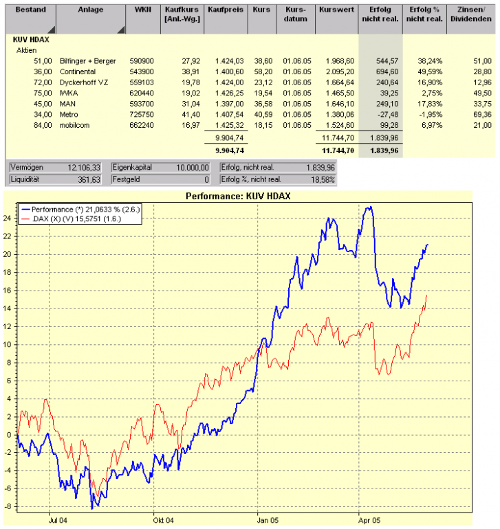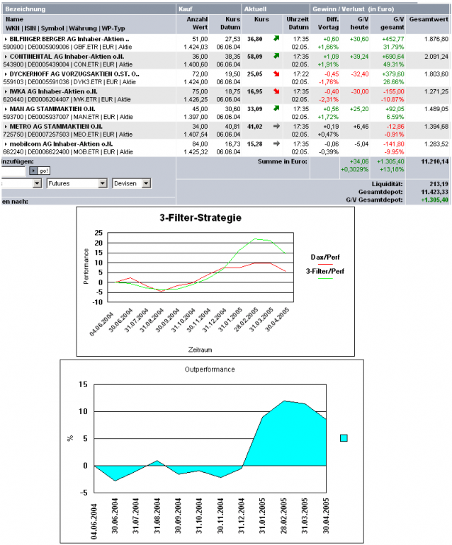 Aktiencrash Juni 2, 2005 So habe die Auswertung noch einmal neu überarbeitet, damit das ganze übersichtlicher wird. Die Dividende von IWKA und MAN ist hier nicht berücksichtigt. Hier also noch einmal die Auswertung für Mai 2005 Startkapital: 10.000 Depoteröffnung 04.06.04 Diesen Beitrag teilen Link zum Beitrag