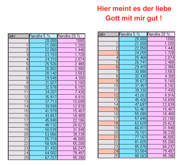 Toni Mai 16, 2005 · bearbeitet Mai 16, 2005 von Toni Ich bin der Auffassung, das mit wenig Zeitaufwand eine Durchschnittsrendite von min. 8-10 % pro Jahr in 5 Jahren drin sein sollte.Andere Anleger quälen sich Tag ein Tag aus mit Charts und Fundamentaldaten rum, das im Endeffekt 20-30 % Rendite (vieleicht) vor dem Komma steht. Der Zeitauffwand ist dabei allerdings so groß, das die Freizeit und das Familienleben leidet. Es macht eigentlich keinen Sinn ... Mein lieber Aktiencrash, ich schätze Deine mühevolle Arbeit, aber ab und zu muss ich doch mal ein wenig kritisieren: Ich gehöre zufällig zu den aktiven Anlegern, die "sich sich Tag ein Tag aus mit Charts und Fundamentaldaten quälen", wie Du es ausdrückst. Du schreibst diesen Leuten die Fähigkeit zu, 20 bis 30% Jahresperformance zu erreichen und sagst im gleichen Atemzug, dass es die Mühe aber nicht wert wäre. Das ganze vor der Annahme, dass das "automatisch geführte" Drei-Filter-Strategie- Depot 8 bis 10% pro Jahr bringen wird. Bei Diskussionen über Rendite sollte man sich immer vergegenwärtigen, wie sich Kapital über einen langen zeitraum verzinst. Und nach Deinen eigenen Aussagen möchtest Du ja über 100 Jahre alt werden, oder? :-) Hier eine Darstellung, die die Verzinsung von 1000 Euro bei verschiedenen Renditen über 25 Jahre zeigt: Angenommen, ein aktiver Investor schafft "nur" 20% pro Jahr, und ein passiver Investor schafft 10% mit irgendeiner Strategie, bei der er nicht viel tun muss, so hat der aktive nach 10 Jahren bereits mehr als das doppelte wie der passive. Nach 25 Jahren wird es krass: Der aktive hat dann mehr als das 9-fache im Vergleich zum passiven. Selbst wenn der aktive nur 15% anstatt 10% (wie der passive) erreicht, hat er nach 25 Jahren mehr als das 3-fache!! Das gebe ich nur zu bedenken. Da kann sich auch einer, der nicht viel Zeit hat, mal überlegen, dass sich das schon lohnen kann. Es hängt halt immer von der Depot-Grösse ab und der Zeit, die man für die Geldanlage vorsieht. Diesen Beitrag teilen Link zum Beitrag