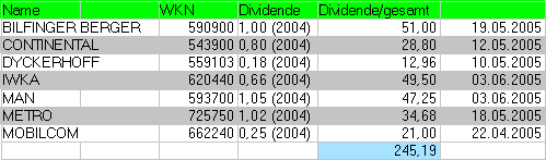 Aktiencrash Mai 28, 2005 Am 04.06.05 ist das Jahr abgelaufen. Hier werde ich noch nachträglich überprüfen, ob bei den im Depot vorhandenen Werten eine Dividende ausgeschüttet wurde und diese nachtragen. Das könnte noch etwas zur Schadensbegrenzung beitragen, was im April verloren wurde. Hier eine Übersicht der anfallenden Dividendenzahlungen (2004) mit den jeweiligen Stichtagen. Insgesamt wird dem Depot somit eine Summe von 245,19 gutgeschrieben. Da sich der Neukauf von Aktien jedes Jahr um einen Tag verschieben würde (Spekulationsfrist), werde ich zum 01.06.05 unter Einhaltung des Freibetrages von 512 + Spesen (120 )=632 folgende Aktien vorab verkaufen. METRO, MOBILCOM, BILFINGER BERGER IWKA wird bis zum 03.06.05 gehalten um die Dividende zu erhalten. Sollte hier noch etwas vom Freibetrag übrig bleiben, wird diese Aktie zum Börsenschluß verkauft. MAN wird bis zum Ablauf der Spekufrist gehalten und um auch hier in den Genuß der Dividende zu kommen. Die DYCKERHOFF Aktien fliegen ebenfalls nach Ablauf der Spekufrist aus dem Depot. Da CONTINENTAL sich für die nächste Runde qualifiziert hat, bleibt diese Aktie gleich im Depot. Die Anzahl der Aktien (Gesamtvermögen ist ist größer wie Startkapital 2004) wird allerdings nicht erhöht. Somit kann die Aktie am 01.06.06 ohne weiteres (Spekufrist) verkauft werden und es werden Kauf.-/Verkaufsspesen gespart. Das überschüssige Bargeld (ca. 300 ) wird auf die neuen Aktien aufgeteilt. Diesen Beitrag teilen Link zum Beitrag