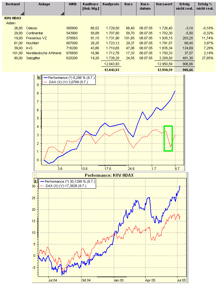 Aktiencrash Juli 8, 2005 Der 1. Monat seit der Neubestückung des Drei Filter Strategie-KUV-Depots ist um. Der pos. Trend hält weiterhin an, was man vom Dax nicht unbedingt sagen kann. Der 07.07.05 (Bombenanschläge in London) hat gestern keine Auswirkungen auf die Performance gehabt, ganz im Gegensatz zum Dax (grüne Rechteck). Im weiteren hat das Depot mit 30,12 % Gesamtperformance seit Auflage einen neuen Höchststand erreicht ! Diesen Beitrag teilen Link zum Beitrag