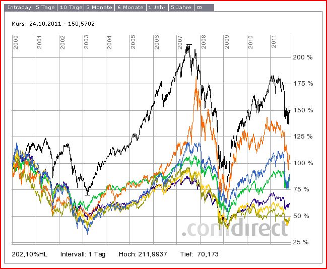 Chemstudent Juli 14, 2012 · bearbeitet Juli 14, 2012 von Chemstudent Sooo schlecht ist der Fonds auch wieder nicht. Er war in bestimmten Marktphasen immer für Überraschungen gut und ist ziemlich unabhängig vom Index. Tatsächlich hat der Fonds während der Dotcom-Blase im Vergleich mit anderen gut abgeschnitten und weniger verloren. Und davon zehrt er in vielen Vergleichen bis heute. Das kann man hier ganz gut sehen, ich hab einmal den MSCI ACWI GDP in EUR verglichen mit dem Lingohr. Seit dem 30.06.2000 sieht das Bild ziemlich beeindruckend aus, der Lingohr liegt klar vorn: Schaut man sich das ganze jedoch nach diesem Ereignis auf bspw. 9-Jahressicht an, ist's so eine Sache... Und die kürzere Vergangenheit, nun direkt mit dem ETF-Portfolio Global (schwarz, Lingohr Blau): Ich bin zwar selsbt kein allzu großer Freund solcher Vergleiche, aber zum Nachdenken über eine Fondsposition können sie durchaus dienen. Diesen Beitrag teilen Link zum Beitrag
