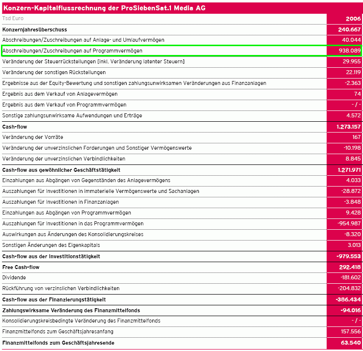 Grumel Mai 8, 2007 · bearbeitet Mai 8, 2007 von Grumel Also, dann hatte ich doch recht. Wenn Pro Sieben einen Film in auftrag gibt, dann ist er nach der Erstausstrahlung deutlich weniger wert ---> Riesen Abschreibung. Oder die Senderechte für US serien. Oft werden die nur auf ein paar Jahre oder für ein paar Ausstrahlungen vergeben, dann sind die Abschreibungen logischerweise besonders hoch. Lange Rede kurzer Sinn: die müssen die Senderechte und was sie selber so produzieren halt aktivieren, und dann halt recht zügig stark abschreiben. Diesen Beitrag teilen Link zum Beitrag