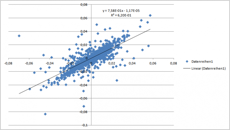 Chemstudent Januar 19, 2012 · bearbeitet Januar 19, 2012 von Chemstudent Irgendwie aus den Augen verloren...Schinzi und ich hatten bzgl. der linearen Regression zwischen dem Fonds und dem Index (DJ-UBS F3T) eine entsprechende PN-Runde. Die von mir ermittelten Daten sind in der Grafik dargestellt. (Tagesbasis!) Demnach hat der Fonds ein negatives Alpha und mit 0,78 eine recht hohe Korrelation mit dem Index. Berücksichtigt man zusätzlich, dass hier die Kursdaten nicht exakt zeitgleich sind (NAV des Fonds wird nicht zur gleichen Zeit festgestelt, wie Schlusskurs des Index), so dürfte das Bild real noch düsterer aussehen. -> Seit Auflegung weniger Rendite als der Index -> negatives alpha -> hohe Korrelation mit dem Index Also ein Fonds, den die Welt nicht braucht. Diesen Beitrag teilen Link zum Beitrag