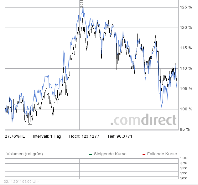 Chemstudent November 24, 2011 · bearbeitet November 24, 2011 von Chemstudent Zufällig mal wieder drüber gestolpert. Anbei ein aktueller Chart im Vergleich mit dem DJ-UBS F3 und DJ-UBS seit Auflegung des Fonds. Legende: Rot: DJ-UBS F3T -> Total Return Variante des Index Lila: DJ-UBS F3ER -> Excess Return Variante des Index Blau: Fonds Grün: DJ-UBS Total Return Alle Werte in USD. Nach wie vor sehe ich bei diesem aktiven Rohstofffuture-Fonds keinen Mehrwert. Näheres dazu hier. ACHTUNG: Wie mir auffiel, habe ich versehentlich im verlinkten Thread damals als Vergleichsindex den Excess Return Index genommen. Bitte beachten! Richtigerweise muss natürlich die Total Return Variante herangezogen werden. (im aktuellen Chart Rot) Zudem noch ein Vergleich seit Auflegung des ETFs ( A1CXBV) auf den DJ-UBS F3T. (In EUR, Schwarz: ETF, Blau: Fonds) Diesen Beitrag teilen Link zum Beitrag