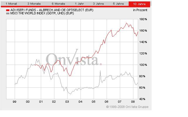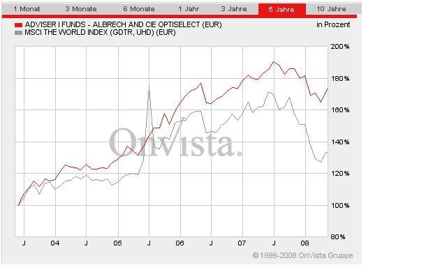 Hustinetenbär Mai 12, 2007 Abend, dachte mir man könnte ja zu einem Fonds einen eigenen Thread aufmachen a la TGF und hätt gern eure Meinung/Ansichten zum Albrech & Cie Optiselect gehört. Hat sich ja bisher vor allem bei Seitwärtsbewegungen bewährt bzw. meist bei Einbrüchen ein bißchen besser abgeschnitten als Vergleichbares. Wie siehts eurer Meinung nach mit den Zukunftsperspektiven des Fonds aus. Lohnt sich ein Investment? Diesen Beitrag teilen Link zum Beitrag