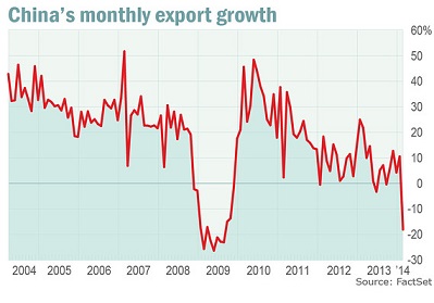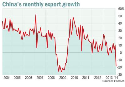 dakac März 12, 2014 Why China’s economy is in trouble in one chart So when China said its exports fell 18.1% year-on-year in February–economists had been expecting growth of 5%–it sparked waves of sales in equities and commodities that reverberated from New York to Frankfurt. Diesen Beitrag teilen Link zum Beitrag