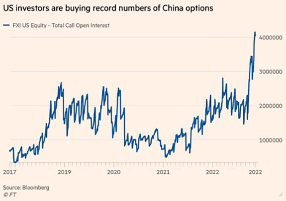 Owl November 22, 2022 https://www.hell-investiert.de/files/media/archiv/HI-22-11-2022.html Zitat Chart der Woche: Ist China doch nicht so doof? Überall hört man, dass China-Investments eher gemieden werden sollten. Ich habe in verschiedenen Podcasts dargelegt, dass ich das Risiko nicht in China investiert zu sein als größer erachte, als in China investiert zu sein. Dies muss jedoch jeder für sich selbst entscheiden und auch sein Risiko wählen. US-Investoren haben sich offenbar entschieden. Die Anzahl an Call-Optionen (Option auf steigende Kurse) ist explodiert. Derartige Werte wurden bisher noch nicht gemessen und deuten darauf hin, dass China in der Gunst von US-Anlegers deutlich gestiegen ist. Etwas verwunderlich in Anbetracht der früheren Anti-China Rhetorik in den USA. Möglicherweise sorgte das Treffen zwischen Biden und XI für neue Zuversicht. Diesen Beitrag teilen Link zum Beitrag