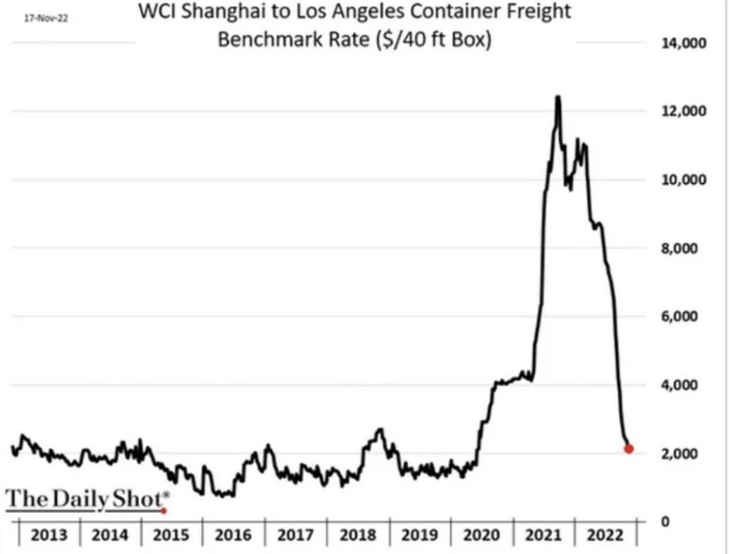 Owl November 23, 2022 Chart of the Day After 2 years of soaring shipping costs, freight costs for a 40-foot shipping container from China to the U.S. west coast are now back to pre-pandemic levels. So, inflation’s over, right? As Real Vision contributor Jim Bianco points out on Twitter, the global supply chain’s inflationary impact is much more complicated than simple container costs. According to Jim, this isn’t an inflation chart, it is a "lockdown damage" chart. China's container shipping volumes are plunging as the country continues to struggle with President Xi’s zero-COVID policy. And when China finally does reopen, that could mean more upside pressure on inflation. Now on Real Vision, Andreas Steno Larsen and the CEO of Damped Spring Advisors, Andy Constan, sit down to dissect whether October’s cooler-than-expected U.S. CPI print was a promising indicator or just another “false dawn.” Andy explains why he leans towards the latter, and shares his “Framework 101” for building portfolios and generating alpha no matter the market environment. As we look ahead to what 2023 will bring, this is one that you won’t want to miss. quelle: https://info.realvision.com/e3t/Ctc/RG+113/cz03G04/VVYGMx2xCWDpW70dGc77V1zzbW6TYKFS4SJ6znN3hBC6X2-MLhV1-WJV7CgP25N1X6rhJjFHglW1CzzG_3QpKClW9cFkWf3jsFMSN5QvfMjlydS_W4ZVMQH98xVHgVvYjrC3NRlCGW8ghSwG95jHfkVxlv963Y9tS6W7YhyPm5QD2NfW6mPWKG1rplCJV3DlTr6rjTT2W3BZX9c6TGCK1W2CfkMh2ZT0yrW5rW6ws7xN_C3W36R6wl7JYfgLW8Bv34Y3Bpnw_W4WB-jp6-MBbDW4CDC485SCd2bN7W0tZPP9DRqN65rkfQ-cr43W7XXXk64mp6nLN4V2xwv2Bb45W5Znxg83mv7_tW7zx2-x6clgBnW4HQvww64B8XqW7J-xzS2kp6N1W7kDLS52TYLQGW92CsBb7Cy0_k3psb1 Diesen Beitrag teilen Link zum Beitrag
