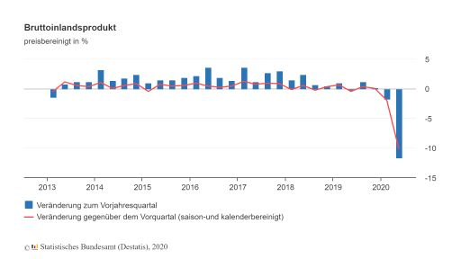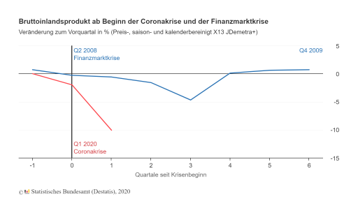 Widofnir Juli 30, 2020 Das Statistische Bundesamt meldet für das 2. Quartal 2020 ein um 10,1% niedrigeres BIP gegenüber dem Vor-Quartal. Zudem sind auch die Im- und Exporte massiv eingebrochen: Ich finde das jetzt nicht überraschend. Man konnte sich ja schon seit Krisenbeginn ausmalen, dass der Lockdown erhebliche Auswirkungen auf die (Welt-)Wirtschaft hat. Umso überraschter bin ich über die Reaktion des DAX auf diese Meldung des Stat. Bundesamtes: Offensichtlich gibt es doch einen Unterschied zwischen dem eingepreisten Sachverhalt und der tatsächlichen Meldung darüber... Beim Stat. Bundesamt gibt es auch einen Krisenmonitor. Hier wird der Vergleich zwischen der Finanzkrise und der Corona-Krise anhand der Konjunkturdaten angestellt. Ein kleiner - wie ich finde bemerkenswerter - Auszug: Diesen Beitrag teilen Link zum Beitrag