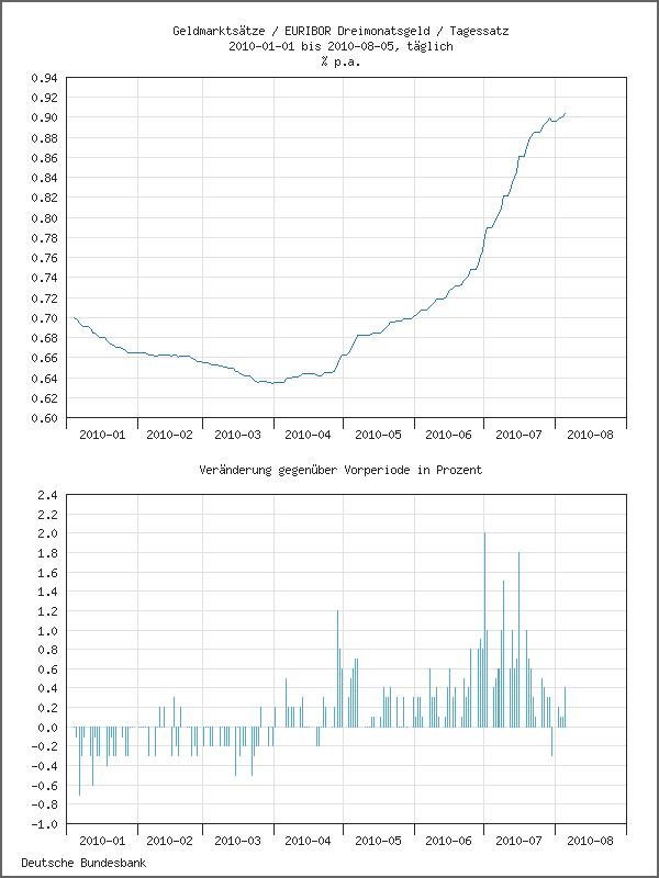 Torman August 6, 2010 Inzwischen ist der 3-Monats-Euribor bei über 0,9%. Der Schwung läßt nach, aber es geht noch immer nach oben. Diesen Beitrag teilen Link zum Beitrag