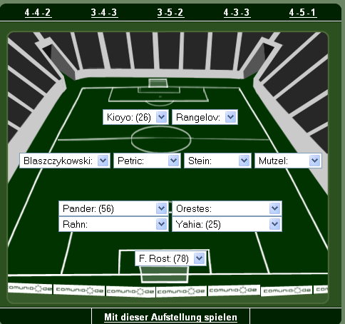 et3rn1ty August 10, 2007 Der FC et3rn1ty United gibt seine Mannschaftsaufstellung für den 1. Spieltag bekannt. Im Tor: Hain Als 4er Abwehrreihe: Kucera, Schuler, Spycher, Filipescu Im Mittelfeld: Köhler, T. Rost, Yelen, Gilberto, Zdebel Als einzige Spitze: Olic Damit dürfte der erste Platz in der Comunio-Tippwertung bereits feststehen. B) Diesen Beitrag teilen Link zum Beitrag
