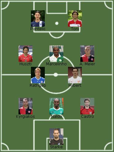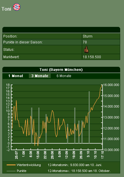 Wishmueller Oktober 18, 2007 awesome. Morgen dann wieder 1,5 Mios runter, aber der "Trend" stimmt zumindest.... Ist auch völlig egal, solange Spieler nicht zum Verkauf anstehen, sind Marktwerte (fast) uninteressant. Interessant wird's erst, wenn der sich Samstag die Hacken bricht und man die Kohle wieder reinvestieren müsste. Allerdings ist der Markt mittlerweile dermaßen geschröpft, dass ja kaum noch was Brauchbares "im höherwertigen Bereich" zur Verfügung steht. Den kleinen Hinweis hab' ich Daniel auch noch mal mitgegeben.... bevor er etwas überhastet seine drei Top-Scorer verscheuert. Was nützt die Kohle, wenn es keine guten Spieler mehr gibt, die man dafür kaufen könnte..... B) So, nach der kleinen "Protz-Einlage" (muss auch mal erlaubt sein.... ) hier wieder das, was für alle von Interesse sein könnte..... 10. Spieltag: Vorraussichtliche Mannschaftsaufstellungen vom Kicker: *) ------------------ Energie Cottbus Piplica - da Silva, Kukielka, I. Mitreski, Cvitanovic - Bassila - S. Angelov, T. Rost - Skela - D. Sörensen, Rangelov Info: Für Trainer Prasnikar gibt es keinen Grund, seine Startelf gegenüber dem 0:0 in Berlin zu ändern. MSV Duisburg Starke - Lamey, Grlic, Schlicke, Weber - Maicon, Tararache - Tiffert, Idrissou - Ailton, Ishiaku Info: Ailton spielt wieder von Beginn an. Daun leidet noch unter den Folgen einer Magen-Darm-Grippe. Mit Ndoum und Tietz rücken zwei Nachwuchsleute in den Kader. ------------------ Werder Bremen Wiese - C. Fritz, Mertesacker, Naldo, Pasanen - Frings - D. Jensen, Borowski - Diego - Sanogo, Hugo Almeida Info: Sanogos Probleme an den Adduktoren sind abgeklungen. Auch Borowski sollte trotz der Rückenprobleme wieder fit sein. Wiese feiert nach seiner Muskelverletzung voraussichtlich sein Comeback. Hertha BSC Berlin Drobny - Chahed, A. Friedrich, Simunic, Fathi - Ebert, Dardai, Mineiro, Gilberto - Pantelic, André Lima Info: André Lima, von Okoronkwo bedrängt, hofft auf eine weitere Chance im Angriff. Im Mittelfeld hat Trainer Favre die Wahl, Ebert kehrt wohl in jedem Fall in die Startelf zurück. ------------------ Bayer 04 Leverkusen R. Adler - Castro, Haggui, Sinkiewicz, Sarpei - Vidal, Rolfes - Kießling, Barbarez, Barnetta - Gekas Info: Sollte Vidal, der erst Freitagmittag vom Länderspiel zurückkommt, fit sein, spielt er neben Rolfes, Faty wäre erste Alternative als Ersatz für den Chilenen. Borussia Dortmund Weidenfeller - P. Degen, Kovac, Brzenska, Dede - Kruska - Tinga, Kringe - Federico - Klimowicz, Petric Info: Kovac vertritt Kapitän Wörns in der Innenverteidigung. Weil Degen wieder seinen Posten als Außenverteidiger bezieht, wird Kringe fürs Mittelfeld frei. Valdez wird erst am Freitag zurückerwartet. Trotz Schulterblessur setzte ihn Paraguay in der WM-Qualifikation ein. ------------------ 1. FC Nürnberg Blazek - Spiranovic, Galasek, Glauber, D. Reinhardt - Mnari, Kluge - Misimovic, Mintal, Kristiansen - Charisteas Info: Nachdem sich Wolf im Training eine Zerrung zuzog, dürfte Trainer Meyer Kapitän Galasek von der "Sechs" zurück in die Innenverteidigung ziehen, wo dieser als freier Mann fungieren wird. Sollte Saenko doch spielen können, müsste für ihn Kristiansen weichen. Eintracht Frankfurt Pröll - P. Ochs, Russ, Kyrgiakos, Spycher - Inamoto, M. Fink - A. Streit, A. Meier, Weissenberger - Amanatidis Info: Da Mahdavikia ausfällt und Thurk angeschlagen ist (Oberschenkelzerrung), sind neben Weissenberger auch Takahara, Heller oder Köhler Alternativen im Mittelfeld. ------------------ Hamburger SV F. Rost - J. Boateng, B. Reinhardt, Mathijsen, Atouba - Jarolim, Kompany - Castelen, Trochowski, Olic - Zidan Info: Kompany ist erster Anwärter auf den Platz neben Jarolim. Entschließt sich Stevens dort für Demel, könnte Kompany Reinhardt aus der Innenverteidigung verdrängen. VFB Stuttgart R. Schäfer - Osorio, Tasci, Pisot, Magnin - Pardo - Hilbert, Khedira - Bastürk - Cacau, Gomez Info: Bastürk ist wieder fit. In der Innenverteidigung spricht vieles für einen Einsatz von David Pisot vom VfB II. ------------------ VFL Bochum Lastuvka - Concha, Maltritz, Yahia, P. Bönig - Sestak, O. Schröder, Zdebel, Grote - Epalle, Mieciel Info: Schröder oder Imhof könnten an Stelle von Dabrowski ins Mittelfeld rücken. Für die linke Seite kommen neben Grote auch Fuchs und Ilicevic infrage. Bayern München Rensing - Lell, Lucio, Demichelis, Jansen - Hamit Altintop, van Bommel, Zé Roberto, Ribery - Toni, Klose Info: Klose ist seit Dienstag wieder im Training, wird wahrscheinlich von Beginn an auflaufen. Bleibt abzuwarten, wie die vielen Nationalspieler von ihren Einsätzen zurückkehren. ------------------ Hansa Rostock Wächter - D. Langen, Sebastian, Orestes, M. Stein - Kern, Beinlich, Rathgeb, Rahn - Agali, Hähnge Info: Wenn Routinier Beinlich grünes Licht signalisiert, wird ihm Trainer Pagelsdorf wohl zum Comeback verhelfen. Bülow, zuletzt nicht so auffällig wie Rathgeb, wäre dann draußen. FC Schalke 04 Neuer - Rafinha, Westermann, Bordon, Rodriguez - F. Ernst - Jones, Bajramovic - Rakitic - Asamoah, Kuranyi Info: Voraussichtlich reicht es bei Pander noch nicht. Rodriguez oder erneut Höwedes wären damit die Kandidaten für links hinten. ------------------ Hannover 96 Enke - Cherundolo, Vinicius, Fahrenhorst, Tarnat - Balitsch, C. Schulz - Rosenthal, S. Pinto, Huszti - Hanke Info: Tarnat steht vor der Rückkehr ins Team, dadurch rückt Schulz wieder ins defensive Mittelfeld. Dort muss voraussichtlich Lala Platz machen. VFL Wolfsburg Jentzsch - Riether, Simunek, Madlung, M. Schäfer - Josué, Thiam - Dejagah, Marcelinho, Krzynowek - Grafite Info: Trainer Magath dürfte der gegen Rostock siegreichen Elf vertrauen. Möglich wäre, dass der konterstarke Munteanu für Krzynowek beginnt. ------------------ Karlsruher SC M. Miller - A. Görlitz, Eggimann, Franz, Eichner - Porcello, Mutzel - Timm, Hajnal, Iashvili - Freis Info: Carnell (Sprunggelenk) ist wieder fit; trotzdem spricht viel dafür, dass Trainer Becker an