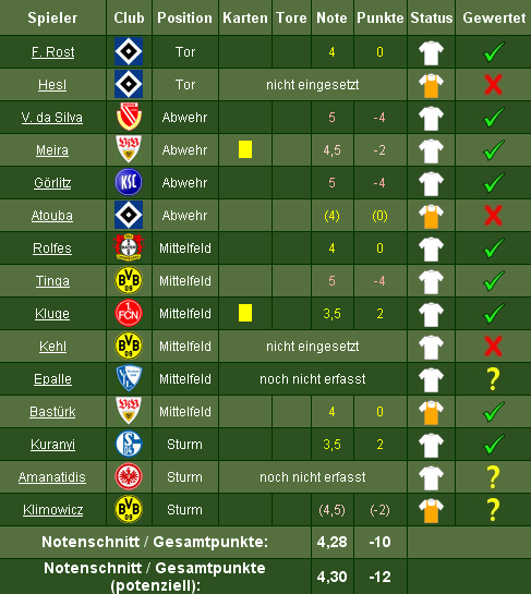 Sebastian ist mit seiner Elf ja schon durch und kann allenfalls noch von Minuspunkten profitieren. Schau'mer mal.... :rolleyes::)