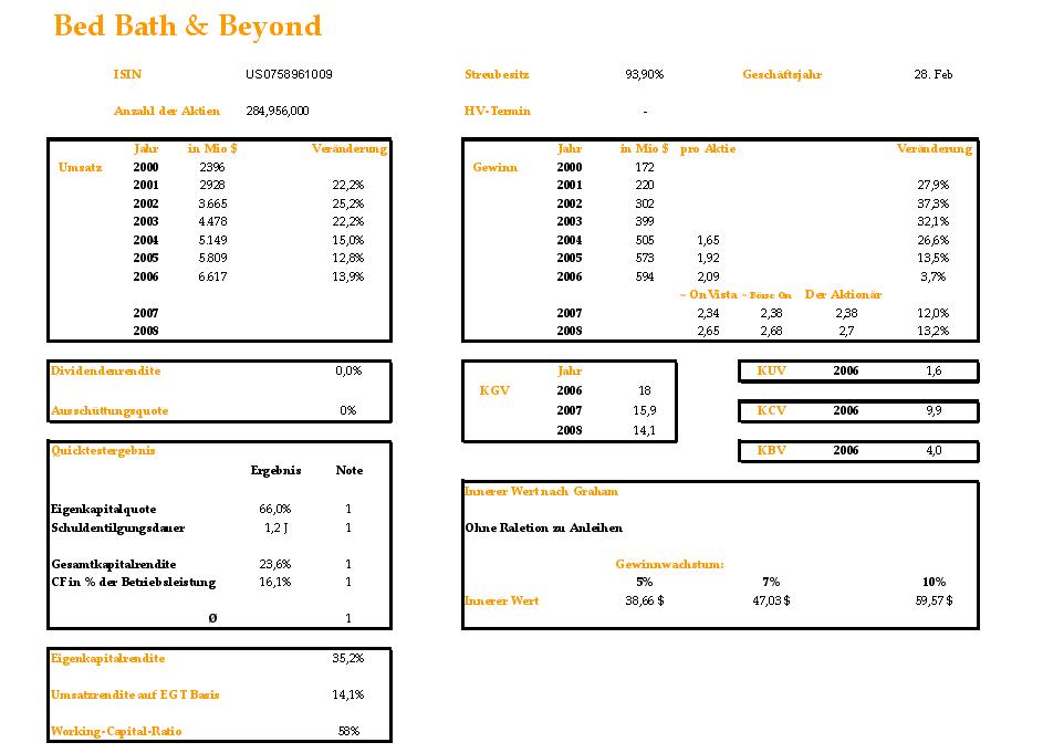 Brandscheid Juni 12, 2007 vielleicht lohnt es sich dieses unternehmen mal genauer anzuschauen. die rentabilitätszahlen stimmen jedenfalls. alle daten laut onvista. Bed Bath & Beyond, 1971 gegründet, vertreibt Haushaltsartikel und Accessoires, Deko- und Zubehörmaterialien des täglichen Bedarfs, wie Küchenartikel, Kissen, Matratzen, Gardinen und Elektrogeräte. Ferner existiert unter der Adresse www.bedbath.com ein Online-Shop. ähnelt für mich ein wenig wie bijou-brigitte. sehr starke filial- und umsatzexpansion in den usa. marktkapitalisierung knapp 8 mrd euro. leider keine kontinuierliche divdidendenpolitik Diesen Beitrag teilen Link zum Beitrag