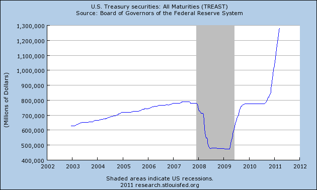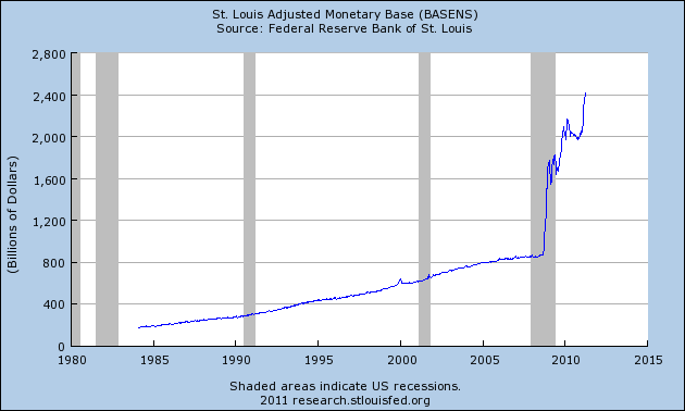 klausk März 24, 2011 · bearbeitet März 24, 2011 von klausk There are several monetary policy tools available to a central bank to expand the money supply of a country: decreasing interest rates by fiat; increasing the monetary base; and decreasing reserve requirements. All have the effect of expanding the money supply. The primary tool of monetary policy is open market operations. This entails managing the quantity of money in circulation through the buying and selling of various financial assets, such as treasury bills, government bonds, or foreign currencies. Purchases of these assets result in currency entering market circulation. Jetzt kommst du der Sache schon näher, magst aber anscheinend nicht den Schluß ziehen: daß die "open market operations" nichts mit einem "Anwerfen der Druckerpresse" zu tun haben. The monetary base is highly liquid money that consists of coins, paper money (both as bank vault cash and as currency circulating in the public), and commercial banks' reserves with the central bank. Das ist die M0-Geldmenge, und die schließt, wie du richtig zitierst, nicht nur Bargeld ein sondern auch die bei der Fed hinterlegten Reserven der Banken. Da steckt das Geld aus QE1 und QE2 -- korrellier die Grafiken mal mit den diversen Stimulus-Aktivitäten seit Bush; die Zeiten der Rezession sind grau unterlegt. Es war durchaus das Ziel dieser Aktionen, die im Herbst 2008 mit dem TARP-Programm (700 Mrd. Dollar) begannen, das Eigenkapital der Banken zu stärken (Basel II und III hatten ähnliche Ziele). Absicht war auch, daß die Banken wieder mehr Kredite, gegen saubere Sicherheiten, an ihre Kundschaft vergeben sollten. Daß sie das nicht oder fast nicht getan haben, ist leider Tatsache. Die Guthaben auf Bankkonten sind Teil der Geldmenge M1, die ebenso wie M2 für Ökonomen bedeutsamer ist als M0. Wenn du neugierig bist, um wieviel größer, vergleich mal deine Giro- und Sparkonten mit dem Inhalt deiner Geldbörse. (Festgeld, Tagesgeld, Bundesanleihen etc. sind weniger liquide und gehören zu M2.) Diesen Beitrag teilen Link zum Beitrag