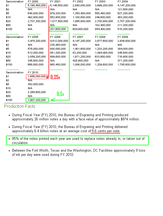 losemoremoney März 24, 2011 Peter Schiff Wäre nett, wenn du die Quelle etwas genauer angegeben hättest. Ich habe nicht vor, mir ganze Blogs reinzuziehen. Zur Sache: Quantitative Easing erhöht die Geldmenge; das wird oft "printing money" genannt. Wenn die Fed "Geld schafft", wird keine Druckerpresse angeworfen, vielmehr wird lediglich eine Zahl im Computer geändert. Die besagt, wieviel Geld die Banken sich von der Fed leihen können, um dann ihrerseits Kredite z.B. an Firmen und Hauskäufer zu vergeben (oder um ihre Bilanz zu schönen). Da wechselt kein einziger Geldschein den Besitzer -- genau so wie wenn dein Arbeitgeber dir das Gehalt überweist. Ich bezweifle, ob QE überhaupt eine nennenswerte Erhöhung im Umlauf von Banknoten zur Folge hatte. Zur Sache zweitens: Der Druck einer US-Banknote kostet vier Cents. Egal ob 1 Dollar drauf steht oder 100. Es werden laufend neue Banknoten gedruckt, als Ersatz für beschädigte oder abgenutzte, die dann eingezogen und vernichtet werden. Wenn irgendwelche Polemiker so reden, wie du zitiert hast, dann entlarven sie ihre eigenen Argumente als blödsinnig -- vielleicht wissen sie das auch, verlassen sich aber darauf, daß ihre Leser/Zuschauer zu blöd sind, das zu bemerken. Alle sind blöd außer Klaus der kennt sich voll aus. Die durchschnittlichen Kosten lagen 2010 bei 9,6 cent je Note. Seit 2000 werden weniger 1 Dollarnoten emittiert, dafür druckt man mehr Scheine mit nen höheren Nennwert. Was wohl mit den durchschnittlichen Produktionskosten geschehen würde, wenn man statt einer 100 Dollarnote 100mal 1 $ drucken würde. Diesen Beitrag teilen Link zum Beitrag