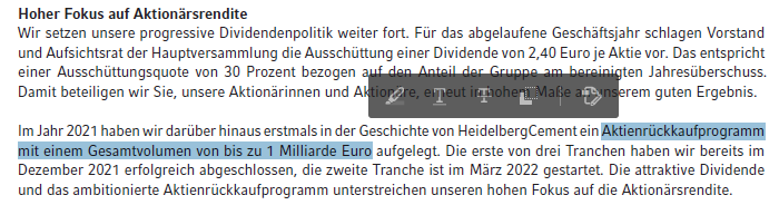 herbert_21 März 24, 2022 · bearbeitet März 24, 2022 von herbert_21 HeidelbergCement erhöht Dividende Vorstand und Aufsichtsrat der HeidelbergCement AG werden der Hauptversammlung vorschlagen, für das Geschäftsjahr 2021 eine Dividende von 2,40 € je Aktie auszuschütten. Dies entspricht einer Steigerung von 9 % gegenüber der Vorjahresdividende von 2,20 € je Aktie. Bezogen auf den Kurs der HeidelbergCement-Aktie am 31. Dezember 2021 beträgt die Dividendenrendite 4,0 %. Die Ausschüttungsquote – im Verhältnis zum Anteil der Gruppe am bereinigten Jahresüberschuss – liegt bei 30 %. Das Unternehmen setzt damit seine progressive Dividendenpolitik fort. Die Dividende ist vorbehaltlich der Zustimmung der Aktionäre in der Hauptversammlung, die am 12. Mai stattfindet. Daneben hat HeidelbergCement heute seinen Geschäftsbericht 2021 veröffentlicht. | Heidelberg IR Sinkende Schulden Die Verschuldung konnte von 6,9 auf 5 Mrd gesenkt werden. Aktienrückkäufe Diesen Beitrag teilen Link zum Beitrag