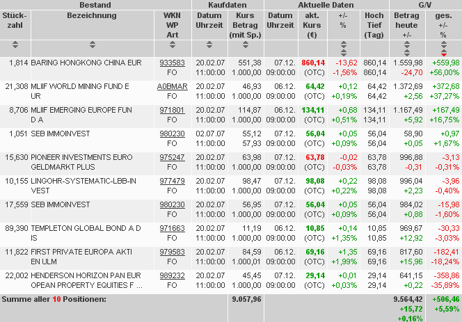 Ist schon erstaunlich, trotz der 2 größten Fondslooser ist das Gesamtdepot jetzt das Beste der 3 Vergleichsdepots, dank des Baring Hong Kong. Wobei die Gesamtperformance von 0,81% in einem knappen Jahr nicht gerade begeistert.
