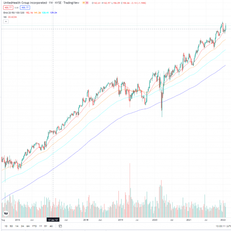 herbert_21 Februar 4, 2022 · bearbeitet Februar 4, 2022 von herbert_21 UnitedHealth Group (UNH) US Health Care (Dow Jones und S&P 500) WKN: 869561 Ticker: UNH ISIN: US91324P1021 Market Cap: $456 Mrd PE: 27 Fwd PE 20 PEG 1,85 Dividendenrendite 2022: 1.19% (annualisiert $5.80) Finviz und Morningstar Investor Relations UnitedHealth Group is a health care and well-being company with a mission to help people live healthier lives and help make the health system work better for everyone. We are 340,000 colleagues in two distinct and complementary businesses working to help build a modern, high-performing health system through improved access, affordability, outcomes and experiences. Vorstellung der Aktie: Fundamentals: Die Aktie überzeugt mit steigenden FCF Umsatz, EPS und Dividenden. Dazu jedes Jahr Aktienrückkäufe. Like clockwork. Chart Im Wochenchart (Bild) starker Aufwärtstrend. Im Tageschart nichts anderes: Siehe auch 19:13 im Video oben. Hervorzuheben noch das niedrige Beta von 0.88. Diesen Beitrag teilen Link zum Beitrag