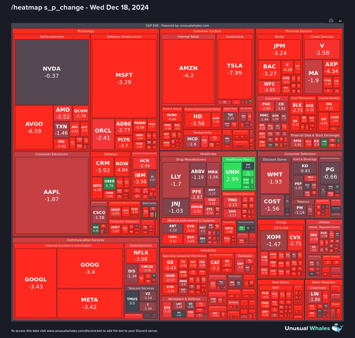 Cinquetti Dezember 19, 2024 · bearbeitet Dezember 19, 2024 von Cinquetti $UNH war heute eine der seltenen grünen Inseln im blutroten S&P-Meer. Der Rest kann sich bei Jerome Powell bedanken (der hoffentlich bald mehr Zeit für seine Hobbys haben wird): Link: https://x.com/unusual_whales/status/1869487816062988340/photo/1 Diesen Beitrag teilen Link zum Beitrag
