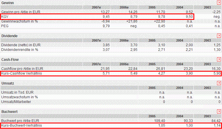 Toni Dezember 9, 2006 · bearbeitet Dezember 9, 2006 von Toni @konfuzius, wie Du am comdirect-Chart erkennen kannst, gab es Anfang 1999 einen Split. Den kannst Du also für Deine Überlegungen vergessen, weil er zu lange her ist und ausserdem wirkt sich ein Split KEINESWEGS auf die fundamentalen Daten eines Unternehmens aus! Seit dem Absturz, also seit 2003, bewegt sich die Aktie in einer schmalen Bahn, und bei Onvista.de kannst Du sehen, dass seit dem keinerlei Überbewertung der Aktie vorliegt: Das KGV ist <10, also günstig. Das KCV ist < 10, also günstig. Das KBV ist ca. =1, also günstig. Fazit: Die Aktie ist preiswert bzw. günstig. NOCHMAL ZUM LERNEN: OB EINE AKTIE PREISWERT IST, HAT MIT DEM AKTIENKURS ALLEIN ABSOLUT GAR NICHTS ZU TUN! Diesen Beitrag teilen Link zum Beitrag