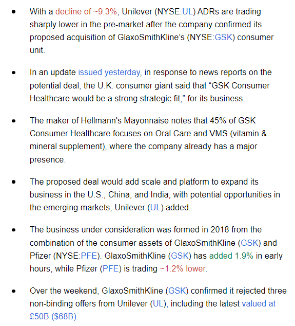 hattifnatt Januar 15, 2022 Auch aktuell: https://www.reuters.com/business/retail-consumer/unilever-offers-50-bln-pounds-gsk-unit-report-2022-01-15/ Zitat The approach by Unilever, which owns brands such as Dove soap and Marmite, for Glaxo's portfolio of household brands including Panadol painkillers and Sensodyne toothpaste was understood to have been unsolicited, the report added. The bid did not include any takeover premium or recognition of synergies, the newspaper said, adding that it was not clear whether the group would make a higher offer. Diesen Beitrag teilen Link zum Beitrag