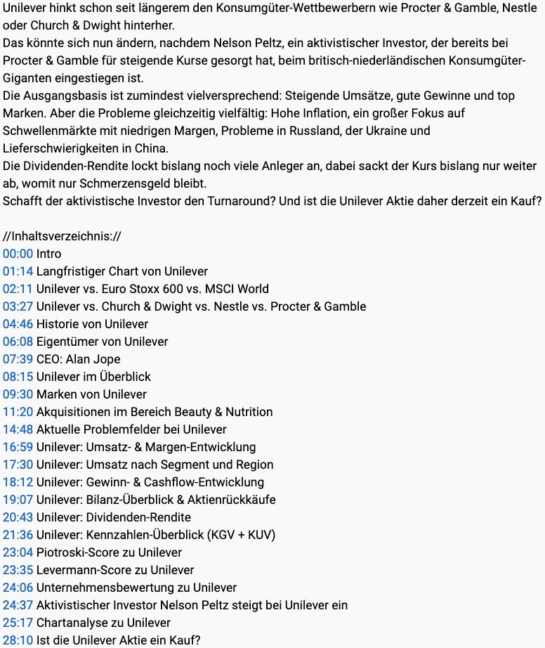 Ronon März 29, 2022 vor 2 Minuten von pete1: Ich schon. Das Wachstum von Unilever ist rückläufig und nähert sich stark der Stagnation an... Man schafft es nichtmal mehr wirklich die Inflation an den Kunden weiterzugeben.. Gleichzeitig trifft das Management verwirrende und falsche Entscheidungen für ein so erwachsenes, altes Unternehmen... Statt versuchen sich nochmal großartig zu verjüngern durch mehr als überteuerte Spartenkäufe (Gott sei dank hat das nicht geklappt), sollte das Geld an den Aktionär gehen durch Rückkäufe und Dividenden... Eine Unterbewertung scheint definitiv nicht gegeben - möglicherweise gehört das Unternehmen noch weiter abgestraft, denn es gibt auf dem KGV- und Robustheitslevel noch einige Unternehmen die organisch im mittleren einstelligen Bereich wachsen und wo das Management weiß was es tun muss.. Diesen Beitrag teilen Link zum Beitrag