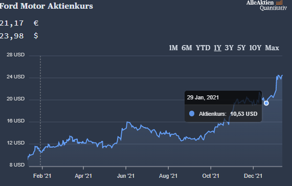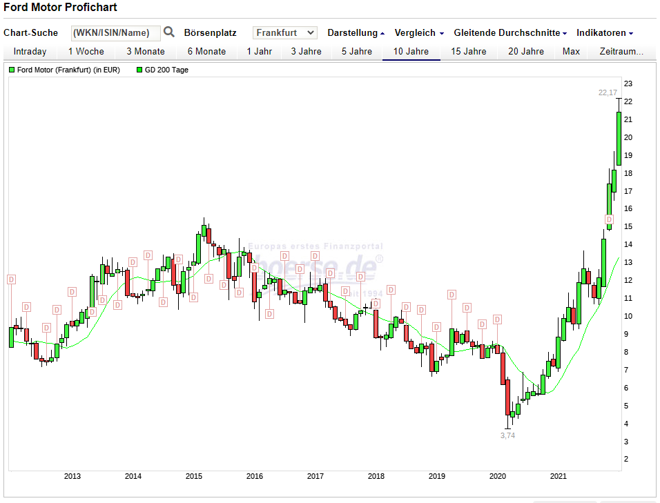 herbert_21 Januar 13, 2022 · bearbeitet Januar 13, 2022 von herbert_21 Ford Motor Ticker F ISIN US3453708600 WKN 502391 Sektor: Zyklischer Konsum Industrie: Automobile Börsenwert 97,31 Mrd. USD Anzahl Aktien 4.025.000.000 Mitarbeiter: 190.000 CEO: Jim Farley Dividende: 10 Cent (entspricht etwa 1,7%) - Artikel von Barron's zur Wiederaufnahme der Dividende 28.10.2021 Website: https://www.ford.com Investor Relations: https://shareholder.ford.com/investors/overview/default.aspx Absatz US 2021: 1.905.955 Stück Absatz weltweit: TBD 1 Jahres Chart Diesen Beitrag teilen Link zum Beitrag