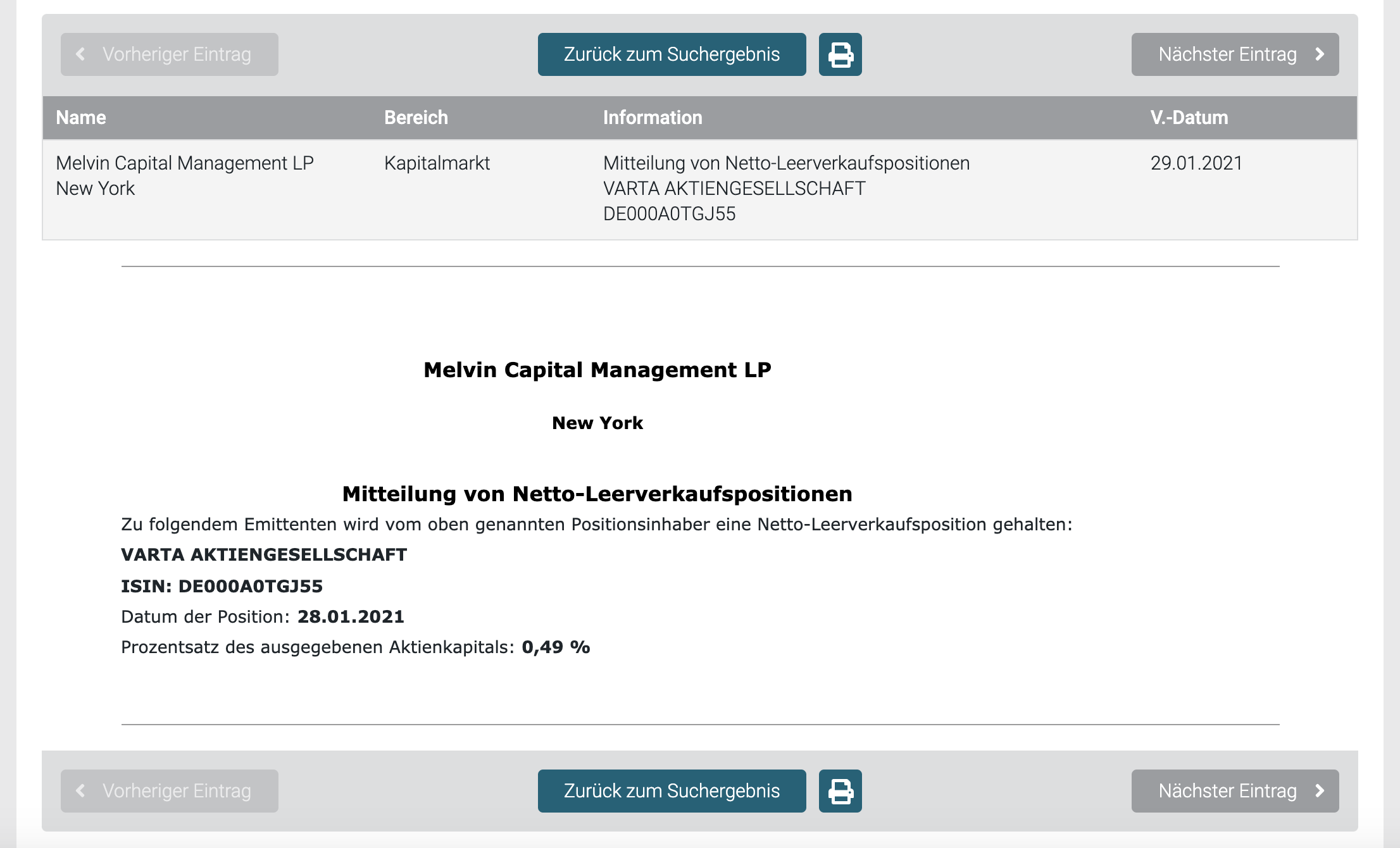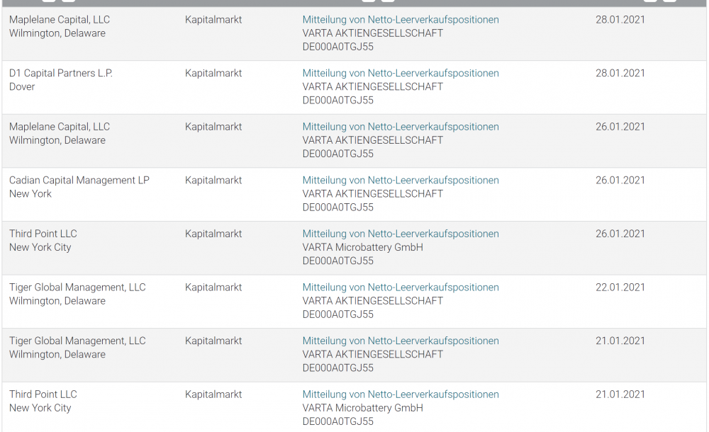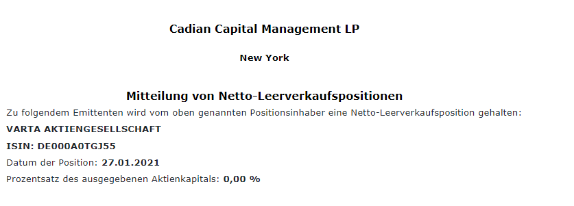 Wuppi Januar 29, 2021 · bearbeitet Januar 29, 2021 von Wuppi Während der Diskussion hier und nach einigen weiteren Recherchen hab ich mich kurz vor US Handelsbeginn dann doch noch dazu entschieden eine Verkaufsorder bei 170€ zu stellen (falls man es nicht glaubt, ich weiß ja wie das hier im Forum im nachhinein kritisch gesehen wird, liefere ich gerne Screenshots ). Was ein Glück das die tatsächlich noch ausgeführt wurde (14:49) denn jetzt knallts bei Varta ja so richtig. Und Melvin Capital, von dem ich oben noch gedacht habe das er sich noch nicht eingedeckt hat, hat soeben die Information rausgegeben das sie nun ihre Position von über 4,3% auf gerade einmal noch 0,49% gesenkt haben. Damit ist die Fantasie der Investoren raus,die auf einen Shortsqueeze spekuliert haben. Diesen Beitrag teilen Link zum Beitrag
