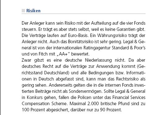 GlobalGrowth Juli 8, 2008 Salute, ich hab die Suchfunktion genutzt um mich etwas über LG zu informieren, allerdings erfolglos. Hier meine konkreten Fragen zur Finanzmarkt-Rentenpolice von Legal&Gerneral Mit dem Gedanken, eine ETF zu besparen freunde ich mich z.Zt. immer mehr an. Das besagte Pordukt bietet die Möglichkeit unter dem Deckmantel einer Versicherung entweder in internationale oder europäische ETF sowie Renten und Geldmarkt zu investieren. Die Kosten betragen pro Jahr insgesamt nur 1% Aufgrund der Steuerproblematik und der Tatsache, dass jetzt doch der Steuerfreibetrag bei mir ausgeschöpft ist, lässt sich damit die Abgeltungssteuer umschiffen. ABER: mir scheint, die Aktienindexfonds dieses britischen Lebensversicherers sind hauseigene, da nirgends ne WKN auftaucht... demzufolge dürfte mein "zukünftiges Vermögen" kein Sondervermögen wie nach deutschem Recht sein? Erschwerend oder erleichternd, kann man sehen wie man will, fällt man nicht unter die Aufsichtskontrolle Bafin sondern unter britisches Recht, weil es keine Tochterfirma in Dtl gibt? Hat jemand Erfahrungen damit? cya David so es ging doch schneller als ich dachte, hier die Antwort zu meiner Email an LG: "Sehr geehrter Herr ...., Legal & General setzt keine ETF's (= börsengehandelte Indexfonds) ein, sondern so genannte interne Fonds, die nur für die Zwecke der Fondspolice zur Verfügung stehen. Es handelt sich somit nicht um Sondervermögen. Die Fondspolice fällt unter den britischen Insolvenzschutz für Versicherungsgesellschaften. Ergänzend weisen wir darauf hin, dass die Kapitalanlagen deutscher Fondspolicen nur deshalb Sondervermögen sind, weil die Versicherungsgesellschaften die Fonds von vertrieblich verbündeten Fondsgesellschaften zukaufen. Die Kapitelanlagen der klassischen überschussbeteiligten Produkte, die von den Versicherungsgesellschaften selbst verwaltet werden, bilden hingegen kein Sondervermögen, sondern fallen unter den deutschen Insolvenzschutz für Versicherungsgesellschaften. Mit freundlichen Grüßen" irgendwie stiftet dasso richtig kein Vertrauen.... ich schreibe die jetzt nochmal an und erfrage die genaue Besicherung meiner Einlagen... die Antwort stell ich euch dann zur Verfügung! Diesen Beitrag teilen Link zum Beitrag