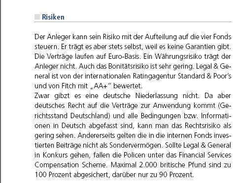 Boersifant Juli 8, 2008 Erschwerend oder erleichternd, kann man sehen wie man will, fällt man nicht unter die Aufsichtskontrolle Bafin sondern unter britisches Recht, weil es keine Tochterfirma in Dtl gibt? Den Vertrag schließt du direkt mit der britischen Gesellschaft, um auch voll in deren Schutzfonds zu sein. Die deutsche Tochterfirma scheint nur für Vertrasgbetreuung und ähnliches da zu sein. Immerhin ist die Bonität von L&G aber hervorragend und der Schutzfonds deckt theoretisch fast alles ab. Wie es im wirklich Insolvenzfall aussehen würde, kann man nicht wissen, aber bei dem riesigen Vermögen, das L&G verwaltet, würde es mich eher wundern, wenn die Ansprüche zu (glaube ich) 90% gedeckt werden könnten. Zumindest würdest du als deutscher Kunde aber nicht benachteiligt werden. Diesen Beitrag teilen Link zum Beitrag