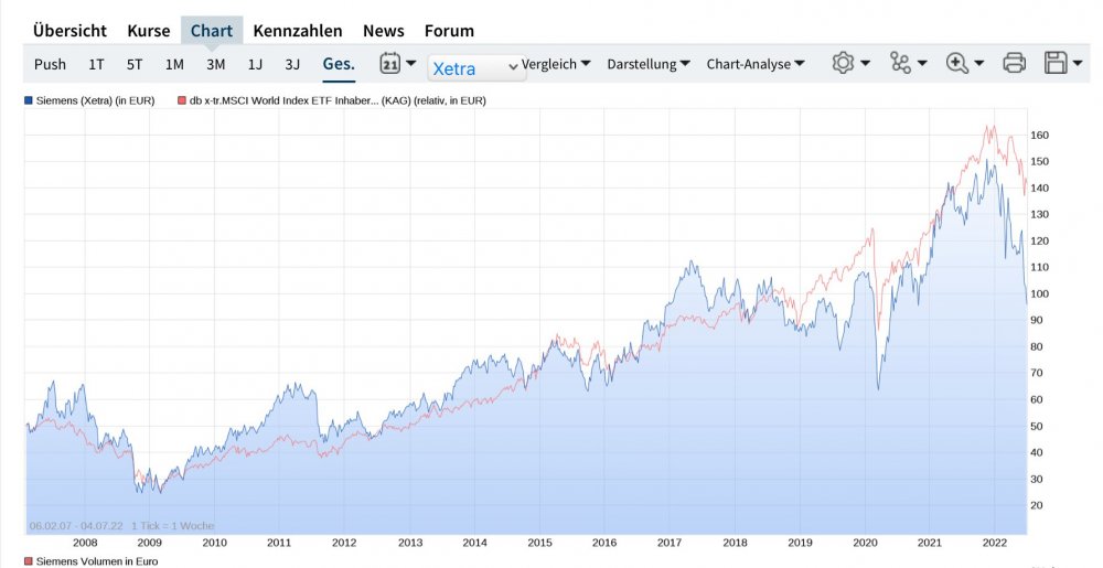 stagflation Juli 4, 2022 · bearbeitet Juli 4, 2022 von stagflation Das ist zwar ein uralter Thread. Aber das Thema "der richtige Index" ist genauso aktuell wie vor 14 Jahren. Gestern hat sich jemand bei Comdirect einen Vergleich zwischen der Entwicklung der Siemens Aktie (gelb) und dem MSCI World Index (blau) anzeigen lassen: Quelle: Comdirect Auf den ersten Blick sieht das schlecht aus für Siemens. Aber es wurden Äpfel mit Birnen verglichen. Von Siemens wird der Kurs-Index angezeigt - vom MSCI World der Performance-Index. Und das auch noch in der Gross Variante! Kein Wunder, dass Siemens so schlecht aussieht! Bei Ariva bekommt man einen besseren Vergleich (wenn man alle Optionen richtig setzt - und darauf achtet, dass Dividenden, Splits und Bezugsrechte eingerechnet werden und dass alles in Euro angezeigt wird): Quelle: Ariva Lange Rede kurzer Sinn: viele von den Tools generierten (und im Web gezeigten!) Diagramme sind unbrauchbar, weil Äpfel mit Birnen verglichen werden. Mit den Tools ist es leicht, irgendwelche Diagramme zu erstellen. Aber es ist schwer, richtige und aussagekräftige Diagramme zu erstellen. Oftmals gibt es noch nicht einmal eine Legende, in der beschrieben wird, was dargestellt wird. Die Frage ist nun: wenn man ein Langzeit-Diagramm mit einem MSCI World Kursverlauf sieht: kann man erkennen, welcher MSCI World Index gezeigt wird? Es gibt folgende Möglichkeit: Das Low am 9.3.2009 und das High am 4.1.2022 sollten relativ leicht erkennbar sein. Oft kann man auch erkennen, wie stark der MSCI World Index zwischen Low und High gestiegen ist. Im oben gezeigten Comdirect Diagramm ist der MSCI World Index bspw. von ungefähr 75% auf 520% gestiegen, als ungefähr um einen Faktor 7. In folgender Tabelle habe ich die Kurs-Steigerungen für die verschiedenen MSCI World Indexe herausgesucht. Damit kann man zumindest grob abschätzen, welcher Index gezeigt wird. Im obigen Comdirect Diagramm scheiden die Price Indexe beispielsweise aus - weil die Kurssteigerung deutlich niedriger ist als ein Faktor 7. Diesen Beitrag teilen Link zum Beitrag