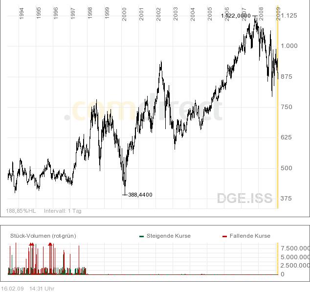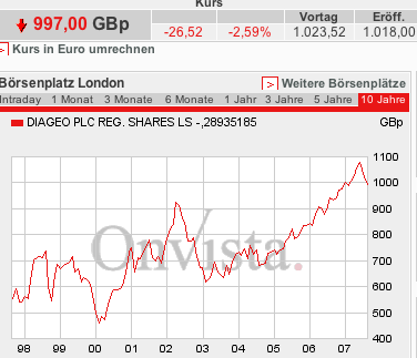 Drella August 16, 2007 Diageo plc (LSE: DGE, NYSE: DEO) is the largest multinational beer, wine and spirits company in the world[citation needed]. The company was formed in 1997 from the merger of Guinness plc and Grand Metropolitan plc and is listed on the London, New York and Irish stock exchanges. The word Diageo was made up from the Latin dia (Day) and the Greek geo (World) and was meant to symbolise the company producing products that are consumed every day throughout the world[citation needed]. The product portfolios of Guinness and GrandMet were largely complementary, with little overlap. * Beer: Guinness, Smithwicks, Red Stripe, Harp Lager, Kilkenny * Scotch whisky: Johnnie Walker, J&B, Bells * Vodka: Smirnoff, Cîroc, Popov * Gin: Gordon's, Tanqueray * Rum: Captain Morgan, Bundaberg * Bourbon: Bulleit * Canadian whisky: Crown Royal, VO, Yukon Jack * Irish whiskey: Bushmills * American whiskey: George Dickel * Tequila: Don Julio * Mixed drinks: Archers, Pimm's * Liqueur: Baileys * Wines: Sterling Vineyards, Beaulieu Vineyard, Blossom Hill imo ein sehr interessantes & markenstarkes unternehmen: sieht alles sehr gut aus! die ekr beträgt 42% !!! jetzt habe ich folgendes problem bei der weiteren analyse: beim eingeben der zahlen in meine tablee konnte ich im gb keine angaben zur aktie finden. weder schlusskurs oder aktienanzahl, marktkapitalisierung noch kgv... bin ich dumm oder stehen die angaben bei dem laden woanders?? danke Diesen Beitrag teilen Link zum Beitrag