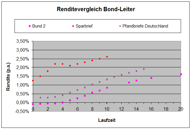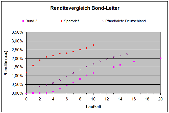 sparfux Juli 13, 2014 · bearbeitet Juli 13, 2014 von sparfux Ein neues Quartal ... ein neues Update. Bund 2 sind die aktuellen Renditen verschiedener Bundeswertpapiere (Quelle) Hypothekenpfandbriefe - Zinsstrukturkurve (Quelle) Sparbrief sind die aktuellen Top-Sparbriefrenditen (Quelle, Quelle) Auf Grund der Zinssenkung der EZB sind die Renditen der öffentlichen Anleihen und auch der Pfandbriefe weiter gesunken. Beim Bund bekommt man bei Laufzeiten bis 3 Jahren ... nichts . Die Renditen der Top-Sparbriefe sind in diesem Fahrwasser auch leicht gesunken, allerdings in geringerem Maße als die Renditen von Bundesanleihen und Pfandbriefen. Die estnische BigBank und die Weltsparen-Angebote habe ich im Vergleich nicht berücksichtigt. Damit ergeben sich ca. 1,8% p.a. Vorsprung für Sparbriefe im kürzeren und mittleren Laufzeitbereich (0-5 Jahre) gegenüber Bundeswertpapieren und ca. 1,48% p.a. gegenüber deutschen Hypothekenpfandbriefen. Der Renditespread ist im Vergleich zum Vorquartal wieder leicht gestiegen (+0,1% vs. Bund/Pfandbriefen). Den Langfristvergleich des Renditespreads Sparbriefe vs. Bundeswertpapiere vs. Pfandbriefe im ersten Post des Threads habe ich aktualisiert. Diesen Beitrag teilen Link zum Beitrag
