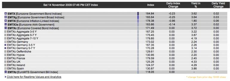 vanity November 14, 2009 · bearbeitet November 14, 2009 von vanity Danke! (mein Browser zickt ein bisschen und hat die Liste nicht angezeigt). Hier ist es sogar noch etwas ausführlicher: http://www.euromtsindex.com/index_new/content/index_data/today/today_realtimec.php Also: EMTXc Aggregate 3,7% bei 5,0 Jahren EMTXc Germany 2,2% bei 2,6 Jahren (schlecht vergleichbar wg. der kurzen Laufzeit, besser wäre der 5-7y mit 3,1% bei 6,5 Jahren) Dann ziehe meine Aussage von oben mal vorerst zurück! Das Factsheet von oben verwirrt mich jetzt aber noch mehr. Es ist zwar vom 30.09.09, aber soviel hat sich den letzten 6 Wochen m. E. nicht bewegt. Hat noch jemand eine Idee, was das dort für Indices sind? Oder ist die Zusammensetzung stark geändert worden? @sparfux: Done! Jetzt weiß ich auch, warum in deiner Signatur das x rot ist. Ich bin wohl nicht der einzige ... :- Diesen Beitrag teilen Link zum Beitrag