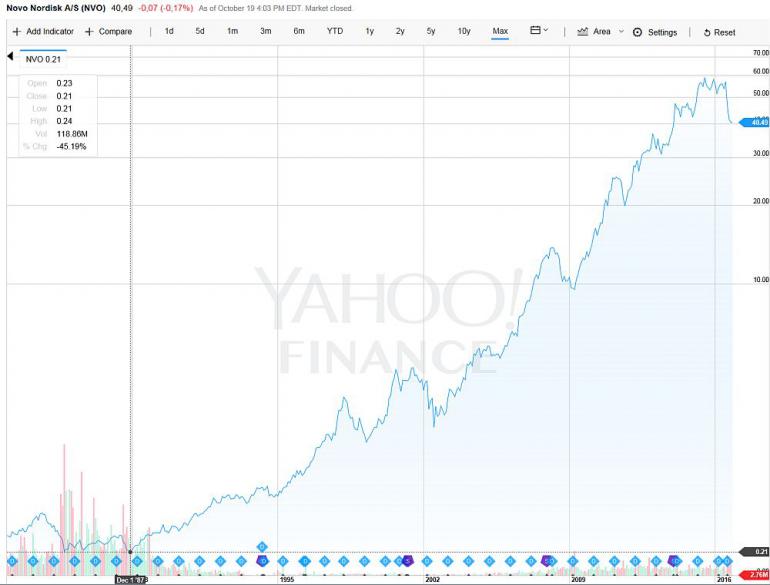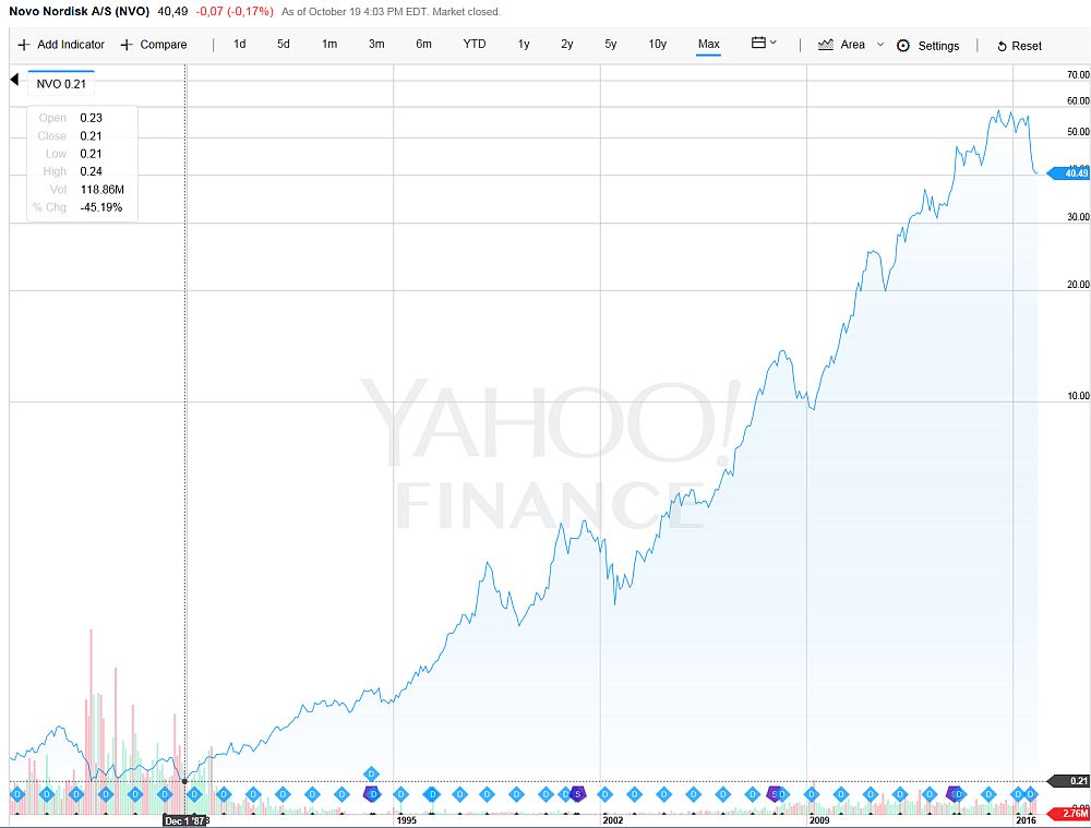 Davon abgesehen sehe ich den aktuellen Vorschlag der WHO eine Extrasteuer auf zuckerhaltige Getränke zu erheben langfristig (im Falle das Regierungen wichtiger Absatzländer dem Vorschlag folgen) als ein potentielles Risiko für Novo Nordisk. Der höhere Preis der Getränke solle den Konsum solcher Getränke reduzieren, so die Weltgesundheitsorganisation. Die Deutsche Gesellschaft für Ernährung weist weiterhin darauf hin, dass insbesondere der Konsum von "zuckergesüßten Getränken" im Verdacht steht das Risiko für Diabetes-Typ 2 zu erhöhen. Bei einer signifikanten Abnahme von potentiellen Diabetespatienten, würde auch die Kundengruppe für das Insulingeschäft von Novo kleiner werden. Nun, es wäre derzeit noch ein recht weiter Weg, aber zumindest ein potentielles Risiko auf lange Sicht.