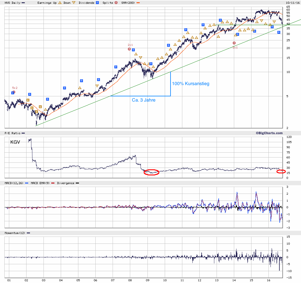 Novo sieht im Charts zwar optisch günstig aus, hat ein stabiles Geschäftmodell, gerade wegen des stagnierenden Umsatzwachstums sehe bei der Bewertung aber durchaus noch Abwärtspotential.
