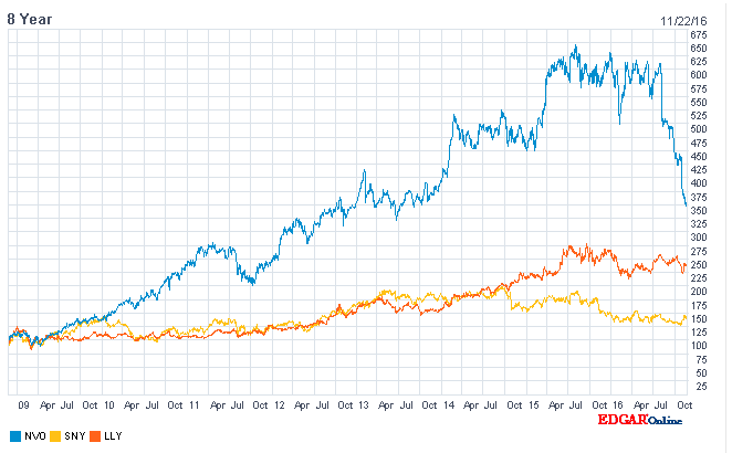 Novo Nordisk ist auf Diabetes spezialisiert. Sanofi und Eli Lilly sind deutlich größer und haben viele verschiedene Anwendungsgebiete. Deshalb mitteln sich die Gewinnmöglichkeiten.