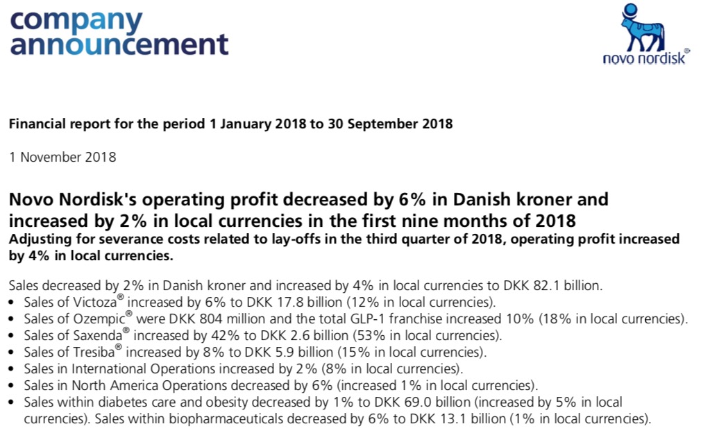 reko November 1, 2018 · bearbeitet November 1, 2018 von reko vor 11 Minuten schrieb Toni: Ok, kann man sehen wie man will. Aber Operating Profit -6% ist ja wohl schlecht! Aber ja nur in Kronen...Na ja... Der Hauptmarkt ist USA. Es ist klar, dass Novo Nordisk Währungskursänderungen nicht an den Endkunden weitergeben kann. Novo Nordisk produziert und vermarktet international. Die Heimatwährung ist für mich wenig relevant. Diesen Beitrag teilen Link zum Beitrag