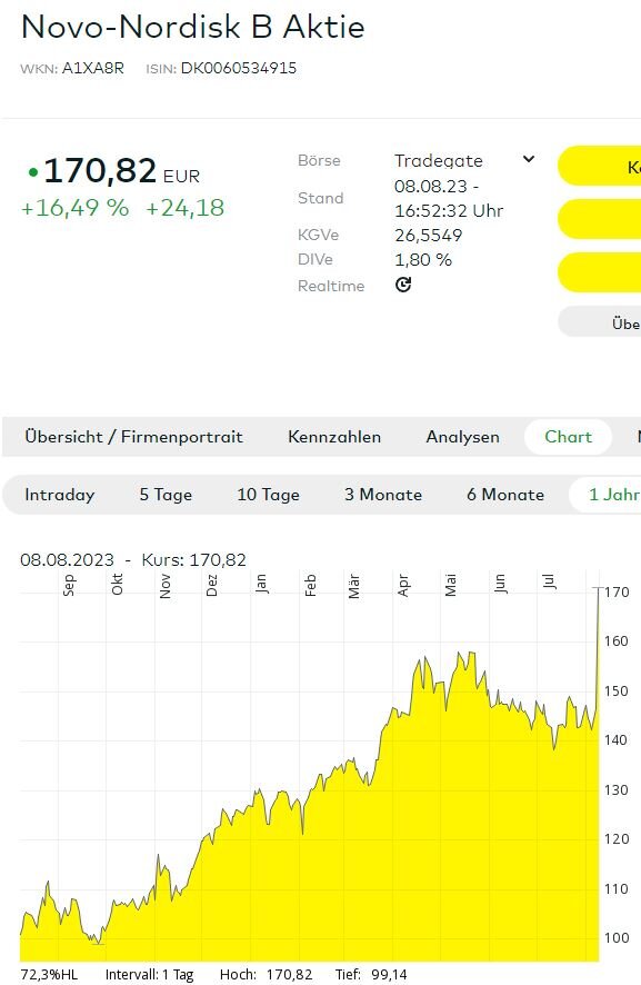 James August 8, 2023 Zitat Paukenschlag bei Novo Nordisk: Mega‑Kurssprung – das ist der Grund Auf der Handelsplattform Tradegate gewinnt das Papier mehr als 15 Prozent auf 168,82 Euro. Damit notiert Novo Nordisk so hoch wie nie zuvor Novo Nordisk sagte am Dienstag, dass sein Adipositas-Medikament Wegovy das Risiko eines schwerwiegenden kardiovaskulären Ereignisses wie eines Schlaganfalls bei übergewichtigen oder fettleibigen Menschen mit Herzerkrankungen in der Vorgeschichte um 20 Prozent reduziert habe. Dies hat die Erwartungen für die Studie bei Weitem übertroffen. https://www.deraktionaer.de/artikel/pharma-biotech/paukenschlag-bei-novo-nordisk-mega-kurssprung-das-ist-der-grund-20337260.html Na das sieht doch mal schön aus, rund 15% heute rauf nach den Testergebnissen jedoch wird das KGV derzeit immer größer und ist mit 40 alles andere als "preiswert". Diesen Beitrag teilen Link zum Beitrag