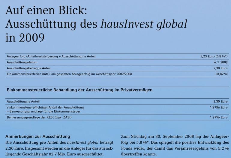 Im abgelaufenen Geschäftsjahr erzielte der Fonds erneut einen hohen steuerfreien Anteil am Anlageerfolg. Dieser lag für Privatanleger bei 58,8 Prozent das war das zweitbeste Ergebnis seit der Auflage des Fonds im Jahr 2003. Dies macht hausInvest global auch aus steuerlicher Sicht attraktiv, da die Nachsteuerrenditen dadurch noch einmal um einiges besser ausfallen als bei voll steuerpflichtigen Vergleichsanlagen. Die Ausschüttung beträgt für das abgelaufene Geschäftsjahr 2,30 Euro je Anteil und bleibt damit konstant. Für Anteile im Privatvermögen sind davon 1,2756 Euro einkommensteuerpflichtig. Somit sind 44,5 Prozent der Ausschüttung je Anteil steuerfrei. Die Ausschüttung erfolgt am 6. Januar 2009.