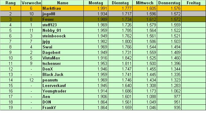 steff123 September 20, 2007 · bearbeitet September 20, 2007 von steff123 Rangliste Donnerstag: Wer wird morgen Steff123 seinen Titel abjagen, oder kann Steff es doch zum 3mal in Folge schaffen.... Spannung !!! Den Titel vielleicht. Aber den Pokal behalte ich. Die Punktezahl kann ja keiner mehr überbieten Das wird spannend morgen Sind ja nur 17 Punkte bis zur Marktfrau Diesen Beitrag teilen Link zum Beitrag