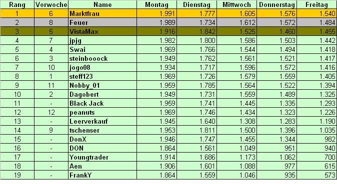 steff123 September 20, 2007 hat ich nicht so verstanden, aber Vistamax wird das schon klären. PS:Jetzt nicht so gierig, wir haben Dich doch schon zwei Wochen gewinnen lassen..... Ich meinte den Satz Der aktuelle Pokalträger muss in der nächsten Woche (Ergänzung: in der nächsten Woche heißt, imaktuellen Zeitraum von Montag bis Freitag) punktemäßig geschlagen werden, damit er den Pokal abgenommen bekommt. D.h. ist jemand in der nächsten Woche punktgleich mit den alten Wochensieger, bleibt der Pokal beim letztwöchigem Sieger. Ist ein eindeutiger Sieger festzustellen, erhält dieser den Wanderpokal Habe ihn beim ersten Lesen so verstanden, dass die Punktezahl der Vorwoche geschlagen werden muss. Aber ich glaube es ist die laufende Woche gemeint. Ich habe mich doch schon so an den Smiley gewöhnt :'( Dann muss ich mit dem DAX nochmal ein paar Worte reden. Oder ist deine Quelle so zuverlässig Diesen Beitrag teilen Link zum Beitrag