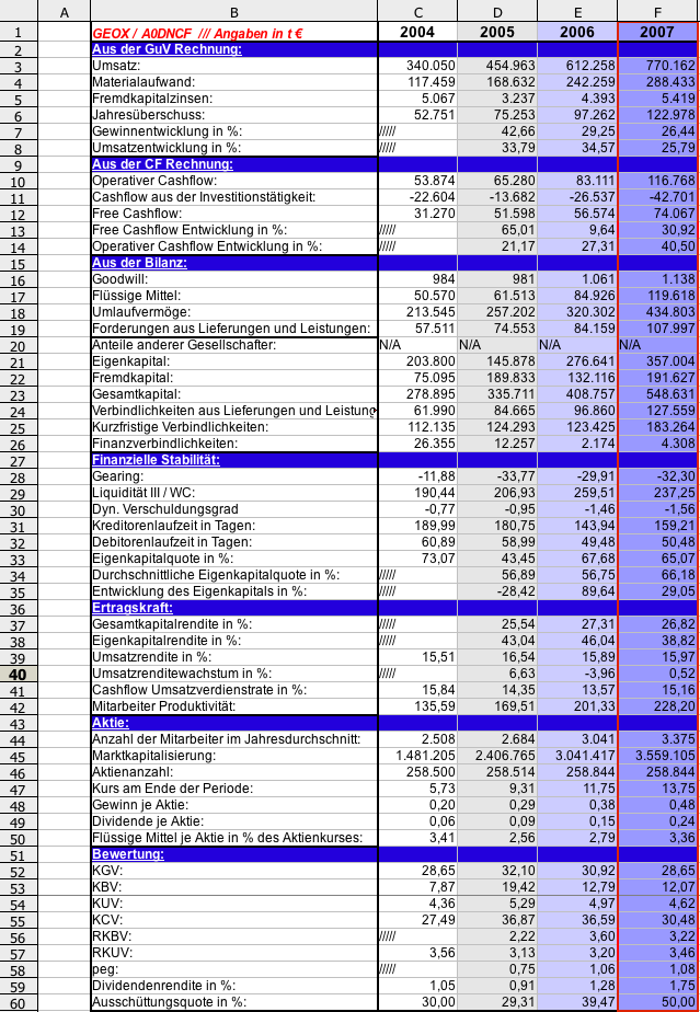 Reigning Lorelai März 9, 2008 Also mit den Zahlen aus dem 2007er Geschäftsbericht und demaktuellen Kurs von 9,26 Euro komme ich auf folgende Bewertung der Aktie: KGV: 20 -> teuer KBV: 8 -> teuer KUV: 3 -> geht so KCV: 20 -> teuer Die Frage ist wie die Aktie in den Vorjahren im Vergleich dazu bewertet war.... aber den Part werde ich übernehmen... ich werde jetzt eben mal mit Kumpels und Kollegen a bisserl Eishockey spielen gehen und so gegen 13 - 14 Uhr werde ich schauen dass ich hier a bisserl was zu Geox poste.. Deinen Bericht Stairway88 werde ich mir dann auch ganz genau anschauen ebenso wie jenen versprochenen im RBS-Thread... Komme da derzeit einfach zu wenig da viel los Gruß W.Hynes Diesen Beitrag teilen Link zum Beitrag