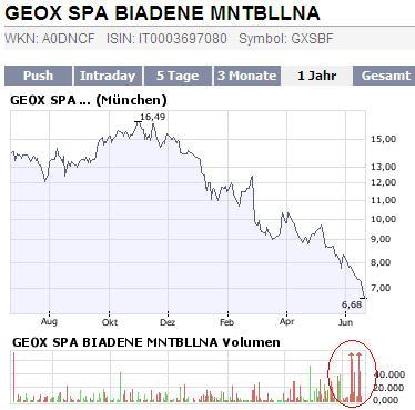 Stairway Juni 20, 2008 · bearbeitet Juni 20, 2008 von Stairway Auffällig sind hier vorallem die hohen Umsätze in den letzten Wochen. Aktuell steht die Aktie damit bei 6,68 € Auf Basis der 2007er Zahlen: KGV: 13,9 ==> günstig KBV: 4,8 ==> gerechtfertigt KUV: 2,9 ==> teuer Auf Basis der erwarteten 2008er Zahlen: KGV: 12,3 ==> günstig KBV: 3,8 ==> gerechtfertigt KUV: ~ 2 ==> ok Alles in allem wird Geox inzwischen extrem interessant. Diesen Beitrag teilen Link zum Beitrag